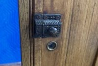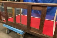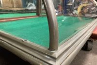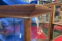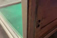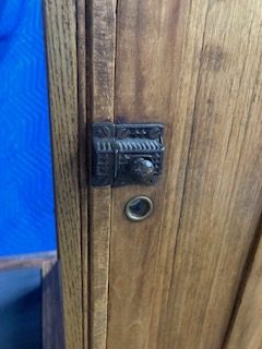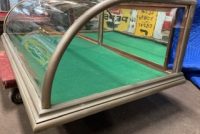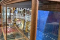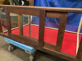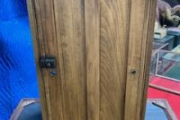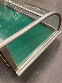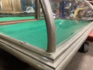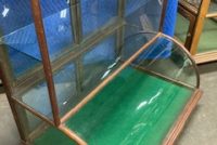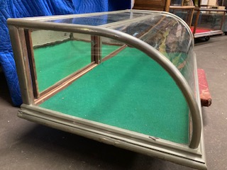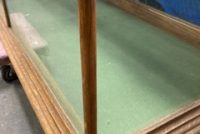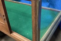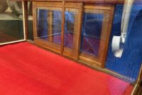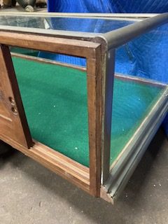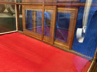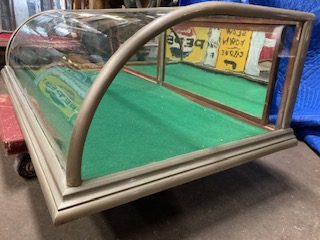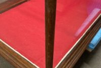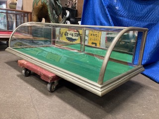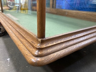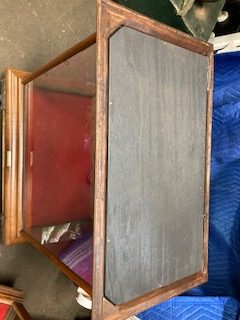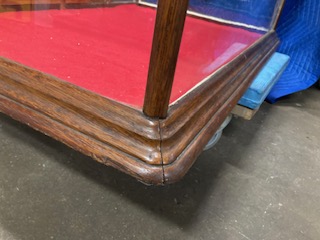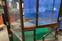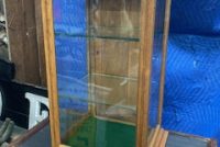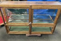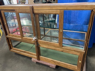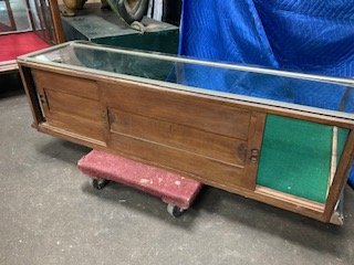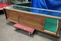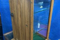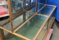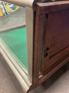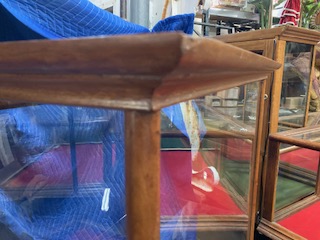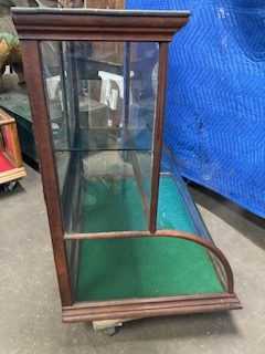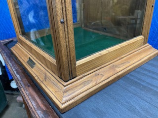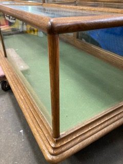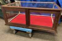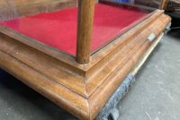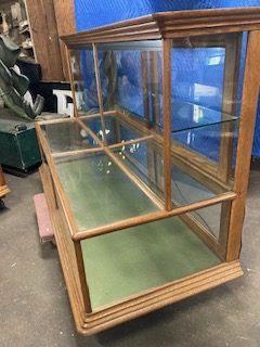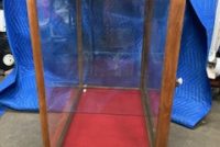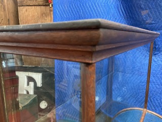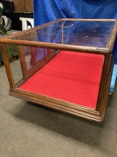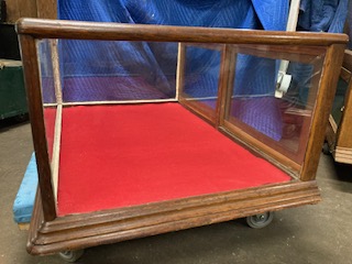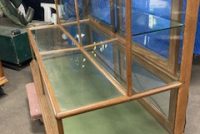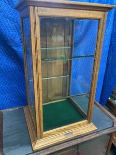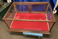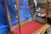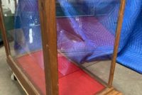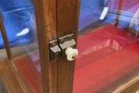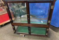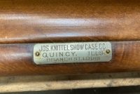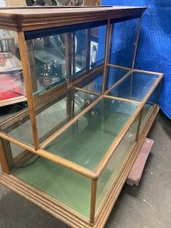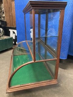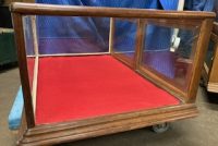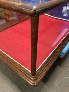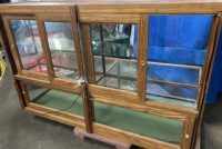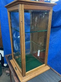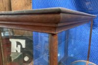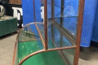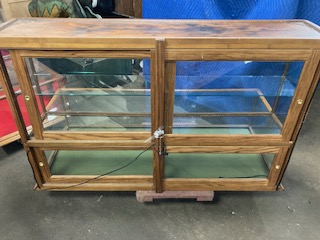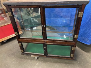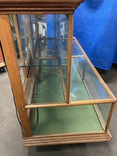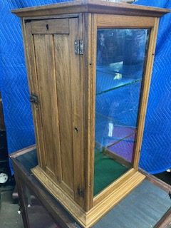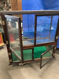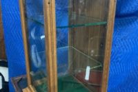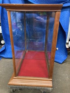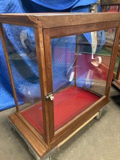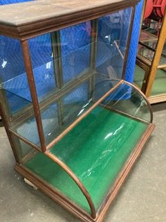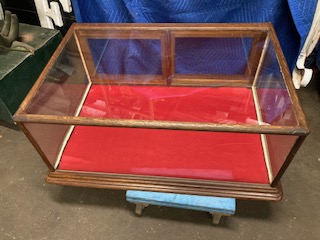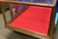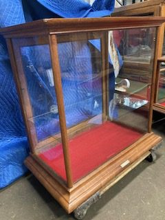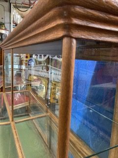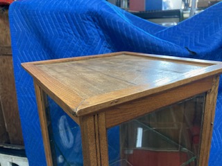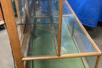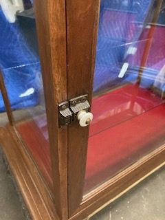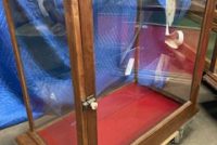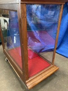 Antique small general store display case in as found condition. Case measures 26 1/2″ tall x 15″ wide x 14″deep. Complete with glass shelves.