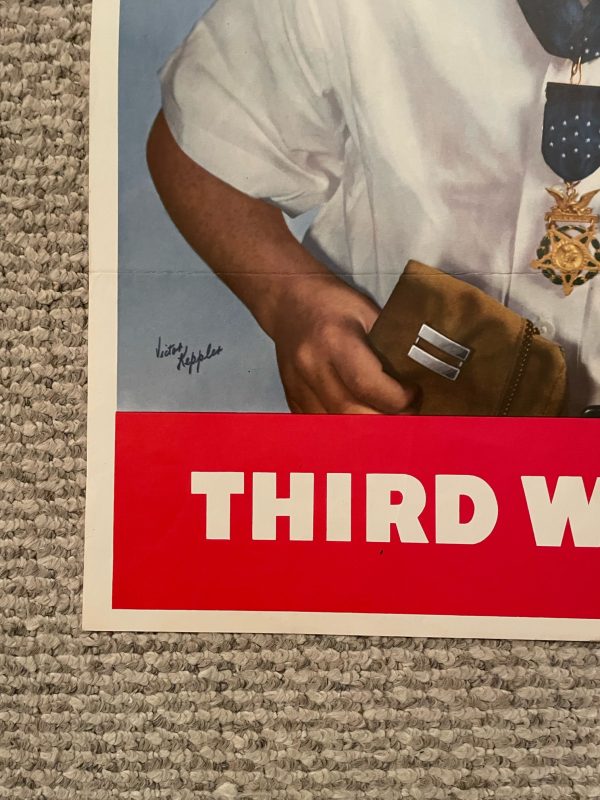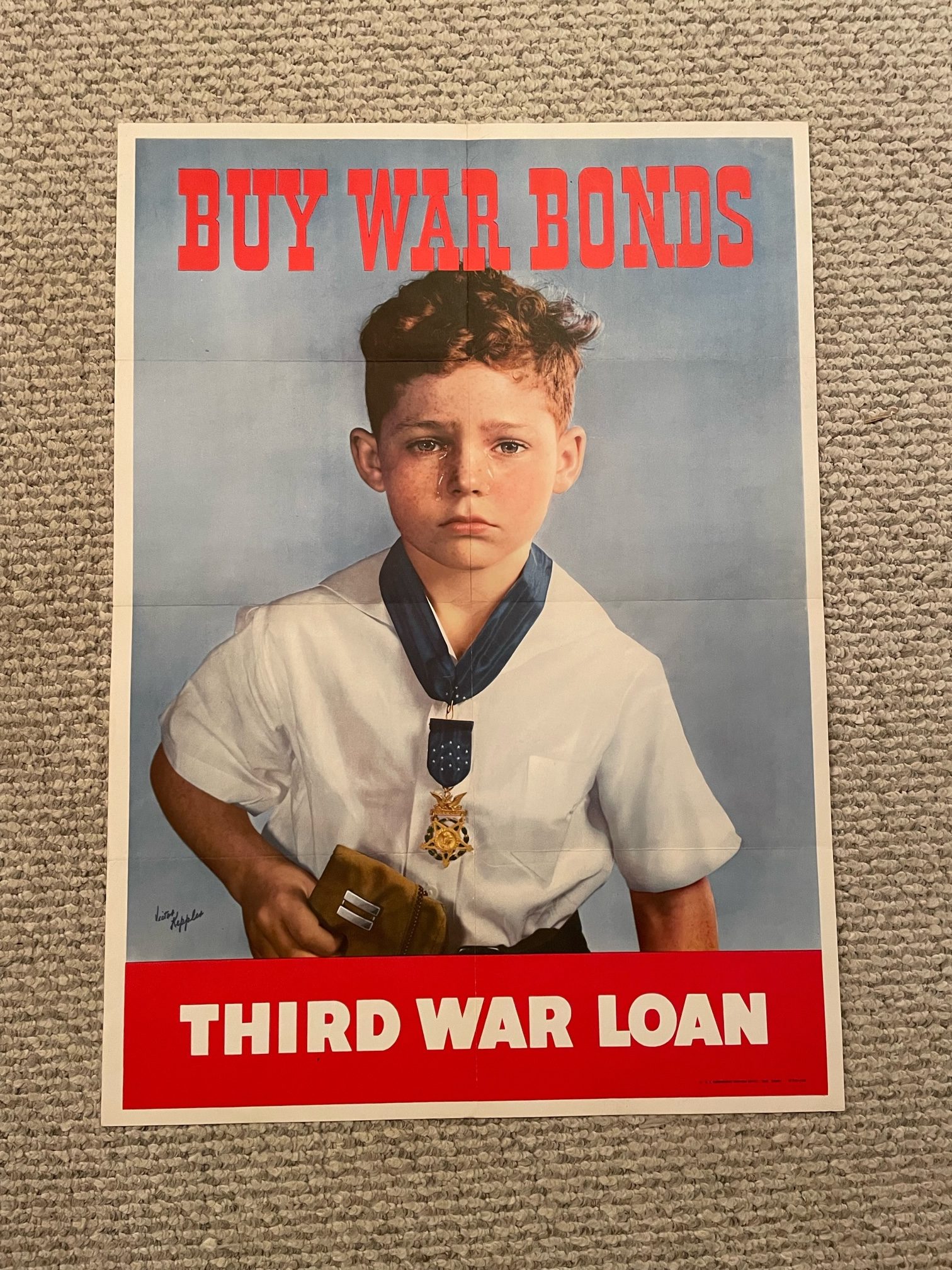 Somber WWII poster showing a crying child who just lost his Medal of Honor reviving father