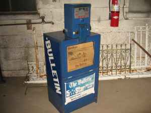 The triple crown of collectibles has just arrived. The package includes a vintage coin operated Philadelphia Bulletin newspaper corner vendor, last issue of the paper and a vendors apron to complete the deal. Not many of these around……………