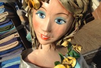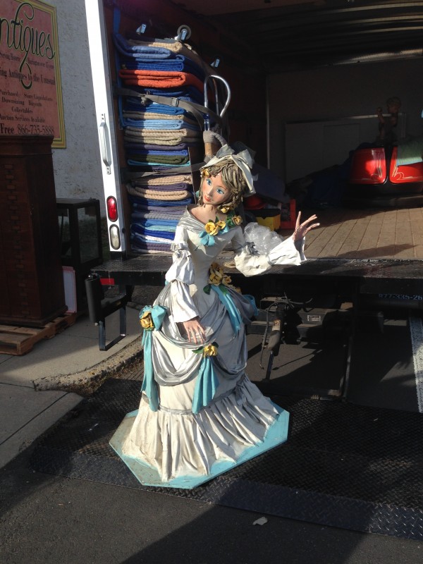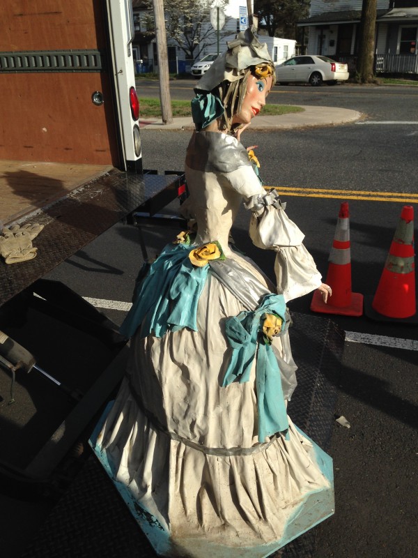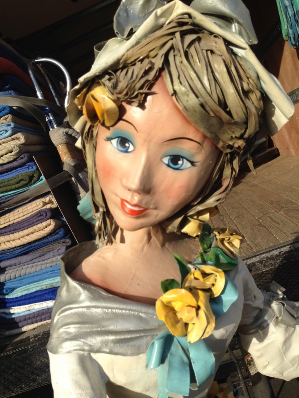 Wonderful vintage old Danbury Fair woman display figure in as found condition. Will need some minor repair but otherwise in very nice condition for it’s age. Made from paper mache, oil cloth and fiberglass coating. Measures about 5′ tall. These figures are very hard to find………….