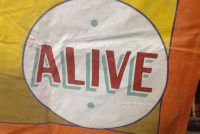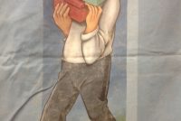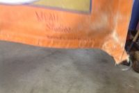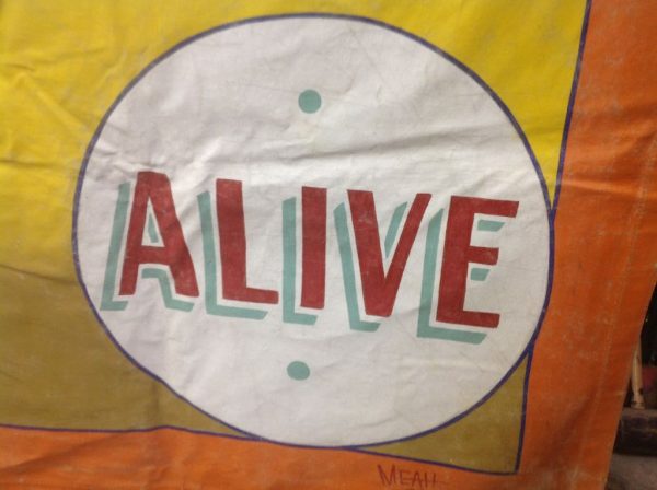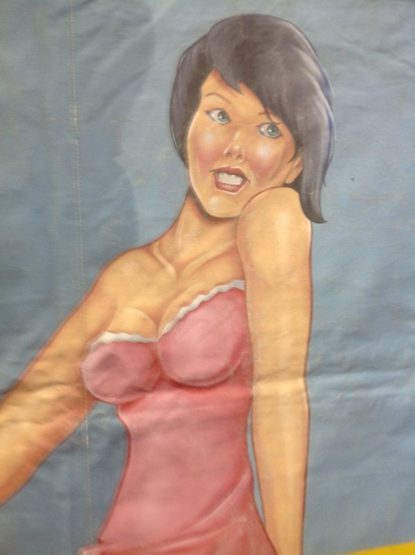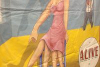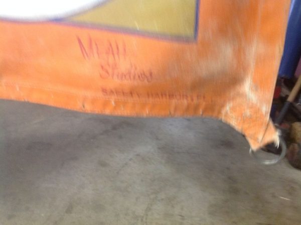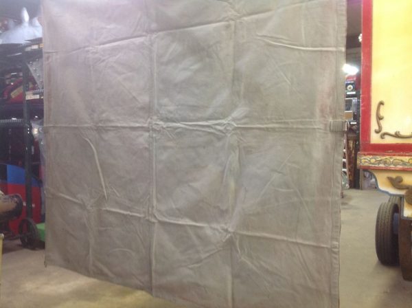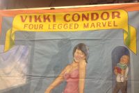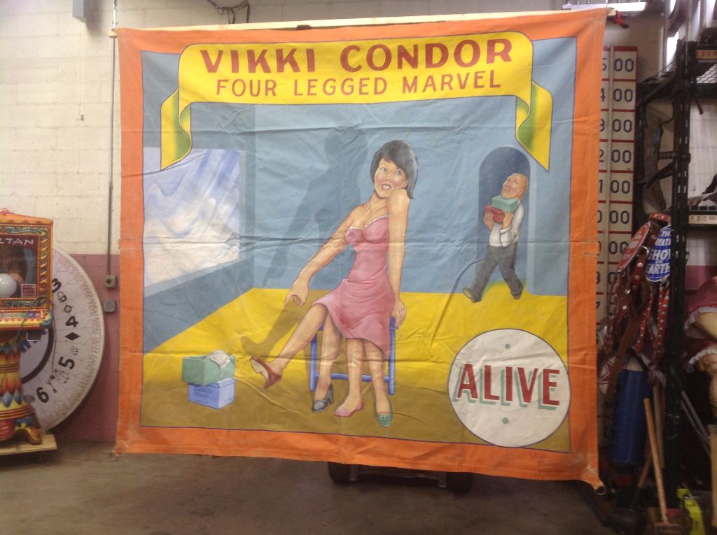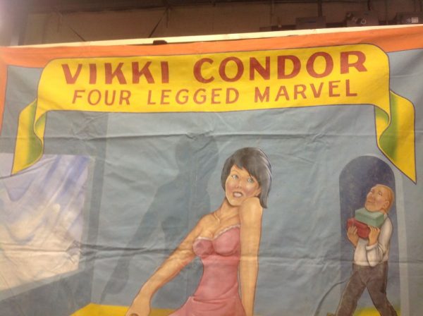 Wow, fantastic sideshow banner of Vikki Condor four legged freak in as found condition. This banner graced the banner line of Ward Hall’s Famous World of Wonders Palace of Illusions sideshow. Taken down and stored away after the last show many years ago. Great subject matter. Measures 7′ x 7′. Painted and signed by Johnny Meah, last of the old sideshow painters. Johnny is currently 83 years old. Check out photo below for banner line…………….