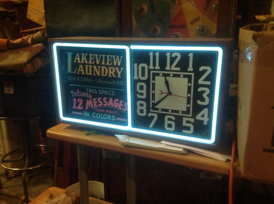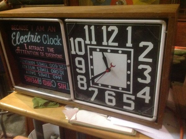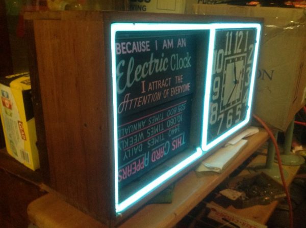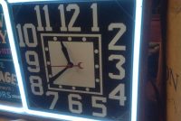 Vintaged 1950’s Action Ad animated neon advertising display clock in as found working condition. Keeps time and advertising rotates as it should……………….