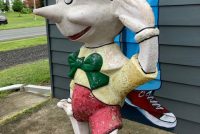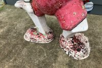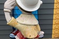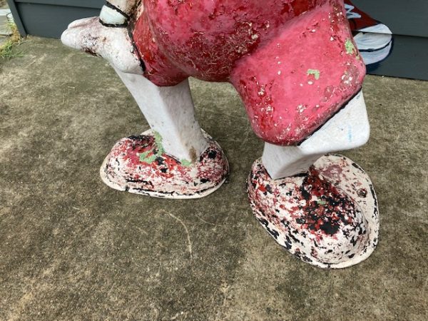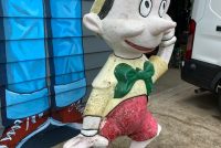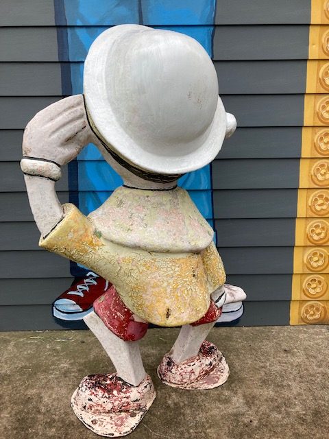 Vintage 1950’s fiberglass miniature golf Pinocchio figure in as found condition. Pinocchio measures 6′ tall x 52″ wide x 3′ deep. Well used needing a new coat of paint or display as is. Quality miniature golf figures are getting harder to find……..