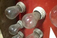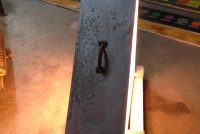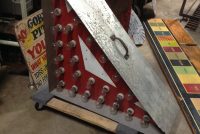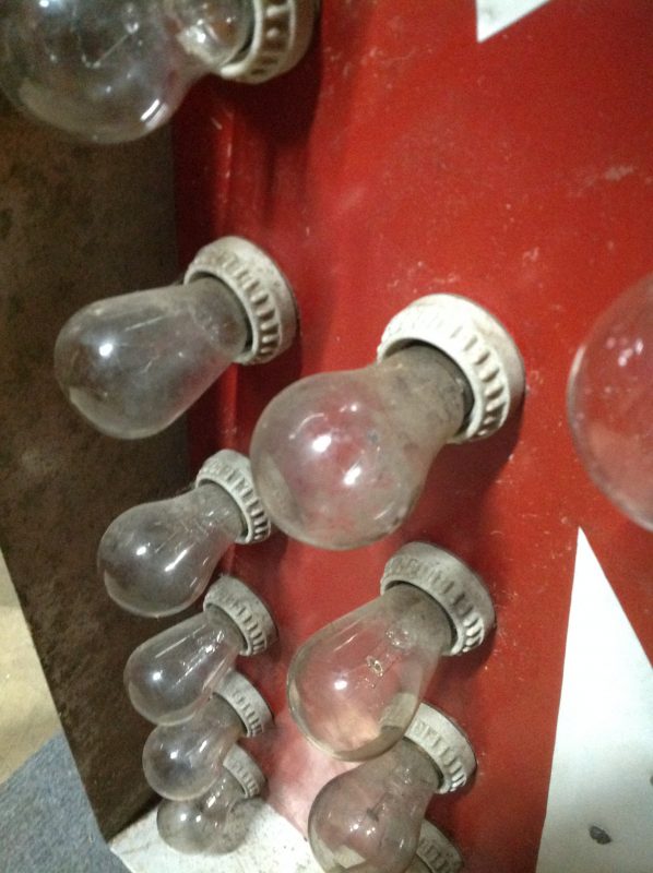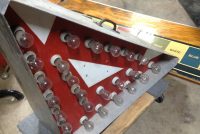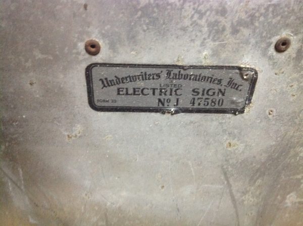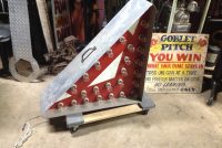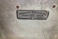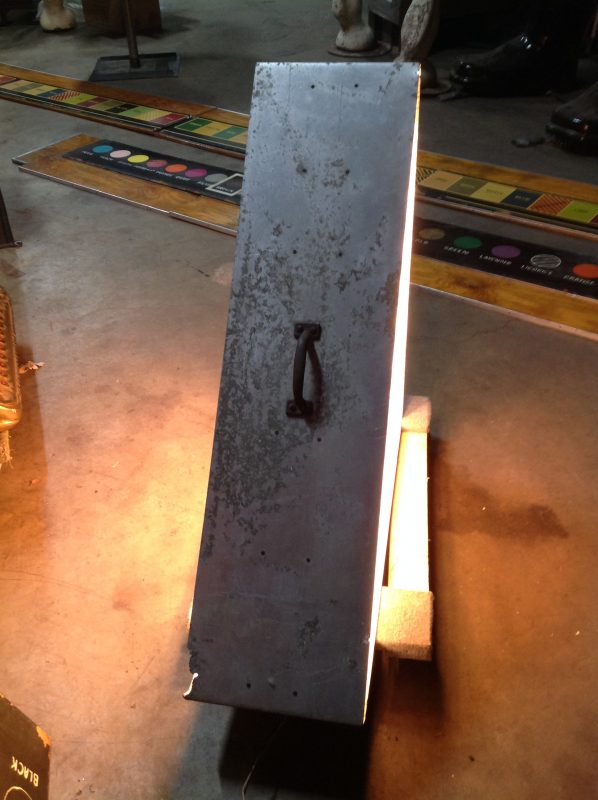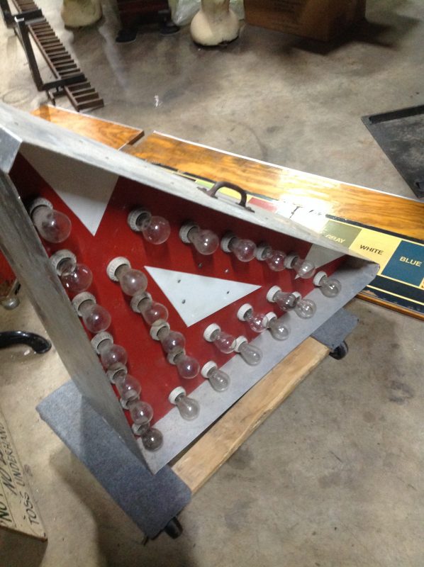 Vintage 1950’s mid-century double sided flashing arrow sign in as found working condition. Nice overall  shape with a small flaw measuring about 4″ x 2″ on one side of outside can.  Includes handle for easy transport………….