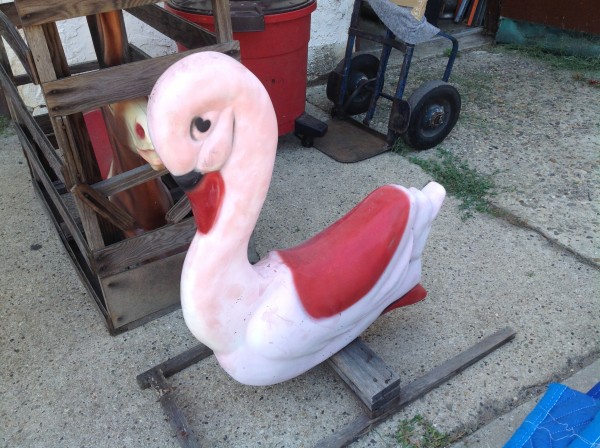 Vintage fiberglass amusement park carousel swan in as found condition. Originally used on a child size coin operated ride. New old stock but shows a few scuff marks………..