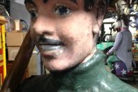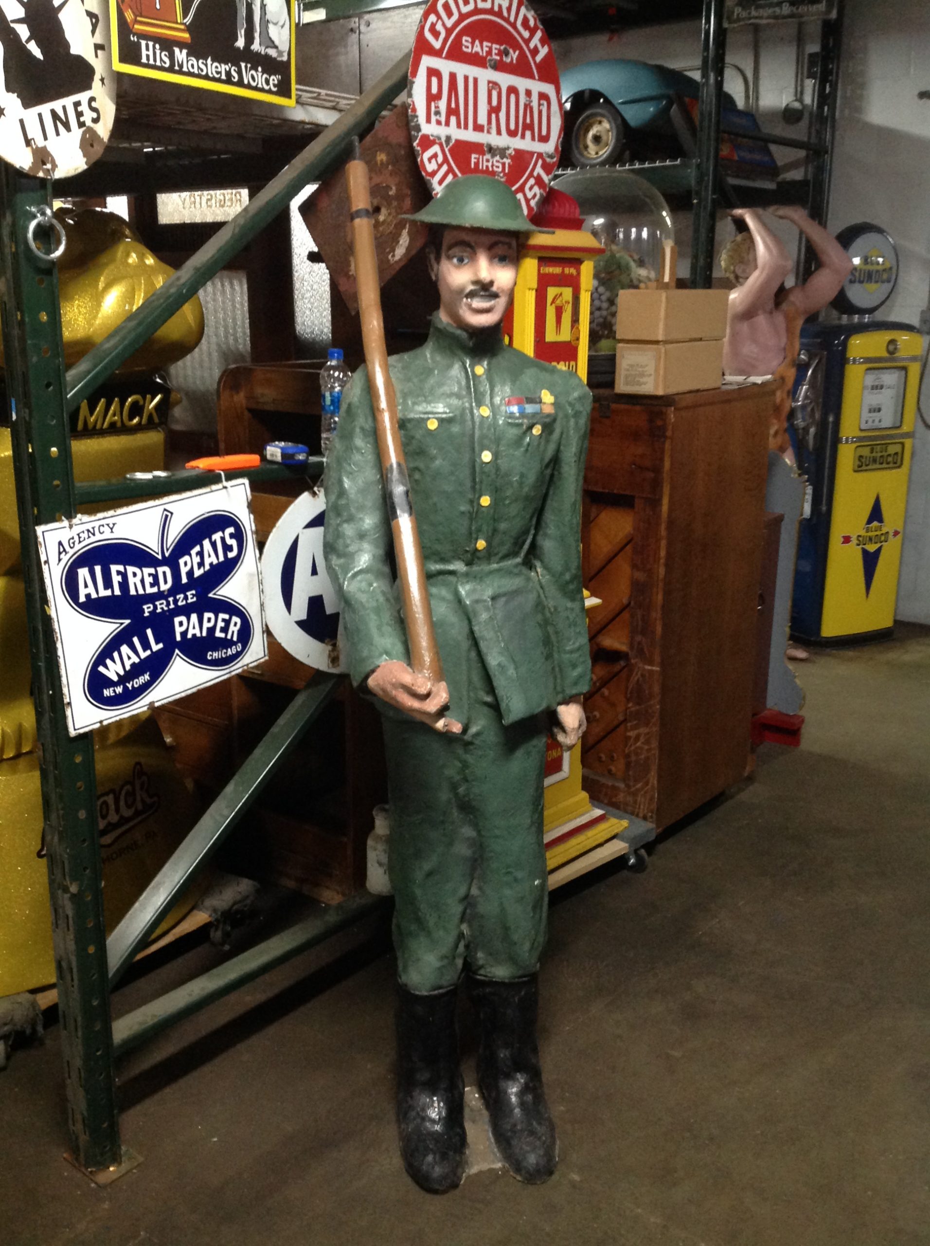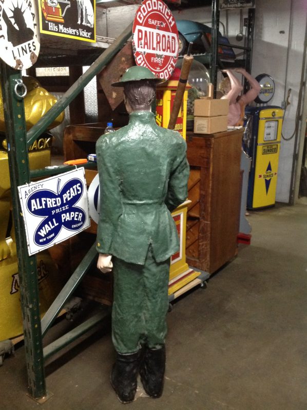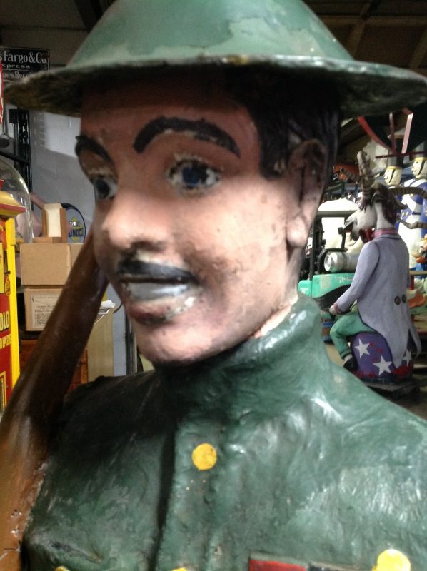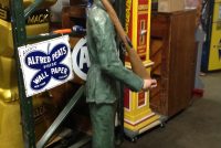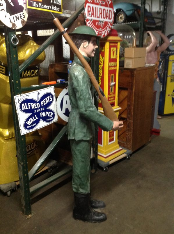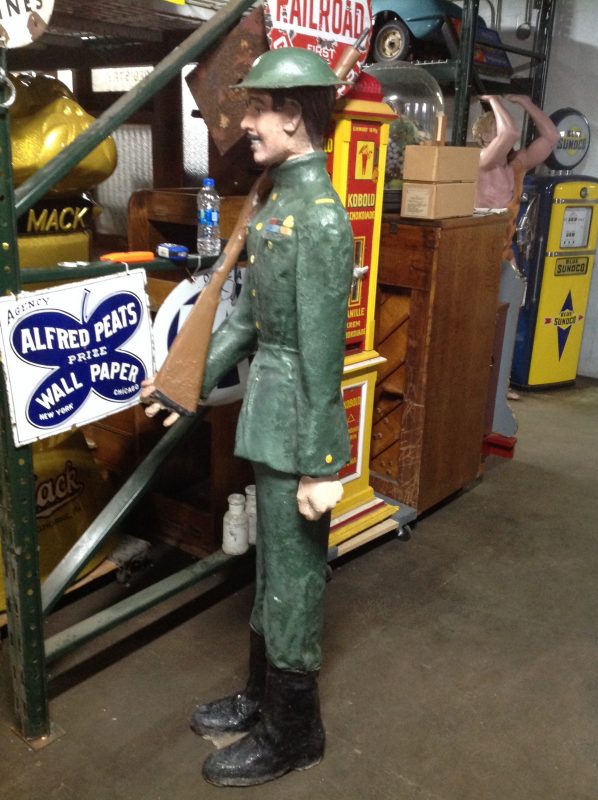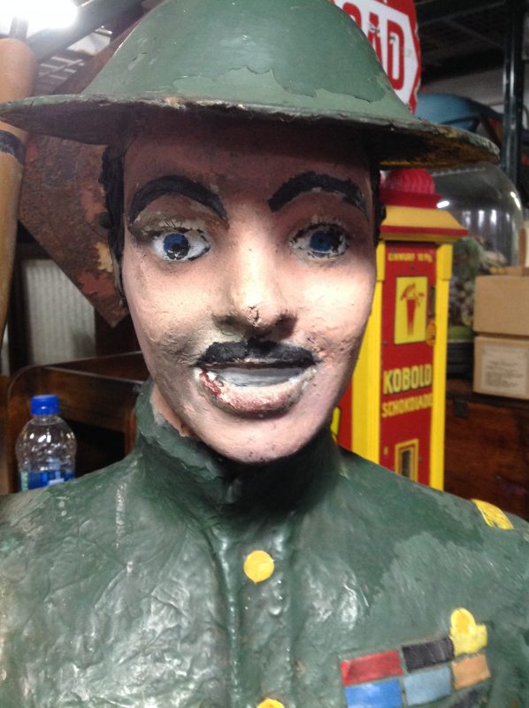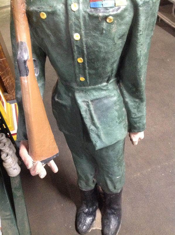 Life size vintage amusement park fiberglass British Army Soldier statue in as found condition. Heavy fiberglass construction. Needs a new home. Just take a look at his face…..