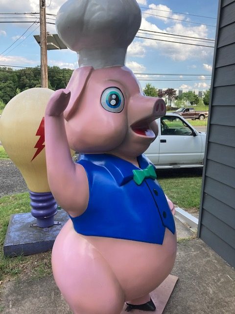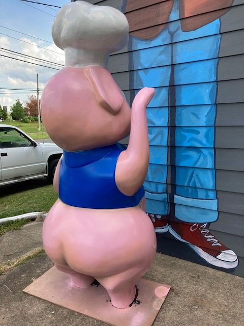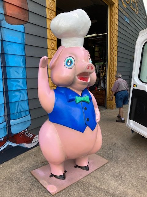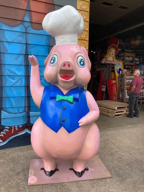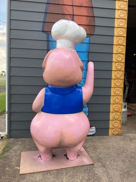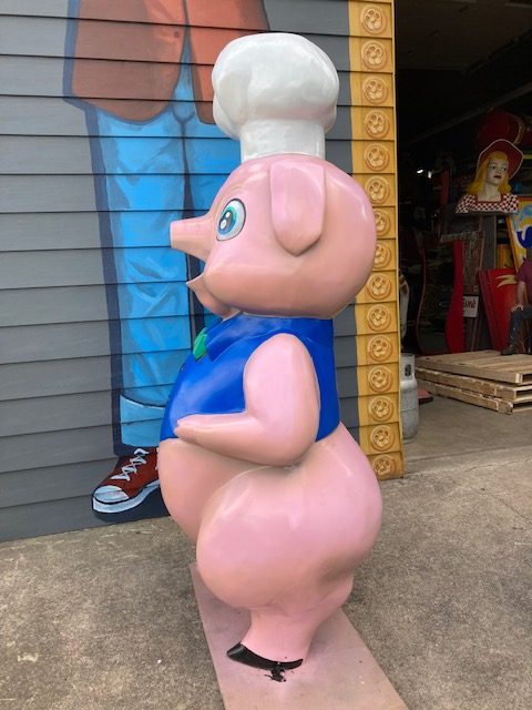 Great vintage 1960’s amusement park fiberglass Chef Pig figure in restored condition. Â Piggy is old style fiberglass construction measuring 8′ tall x 2′ wide x 3′ deep. Quality fiberglass is getting harder to find……….