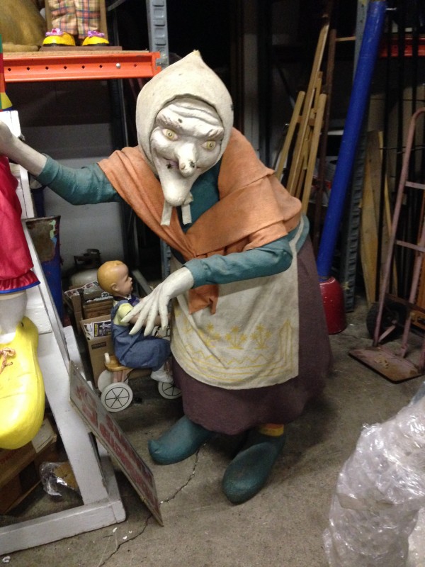 Vintage witch from the fairytale of Hansel and Gretel. Life size made of paper mache, canvas and other artist medium. Nice old vintage look from a now closed children’s amusement park located in the northern part of New Jersey. Perfect for that spot in any childs room……….