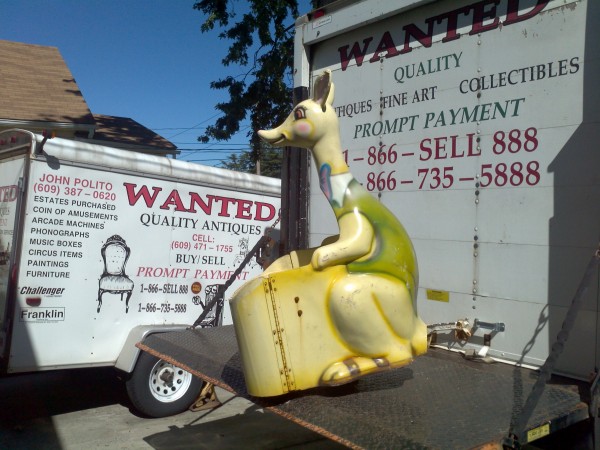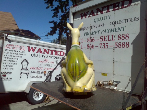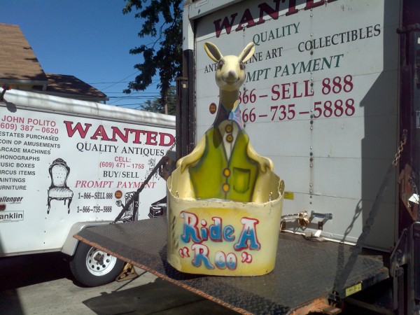 Neat “Ride A Roo” vintage amusement park fiberglass Kangaroo buckets. Will need some cosmetic touch up but otherwise in good as found condition. Use as a planter or make into a seat to use around a bar………….