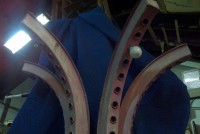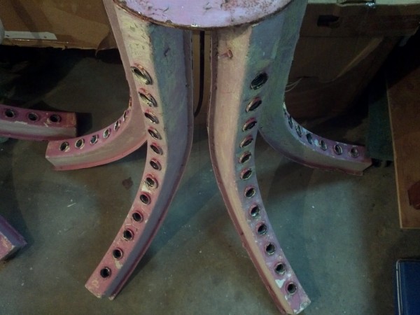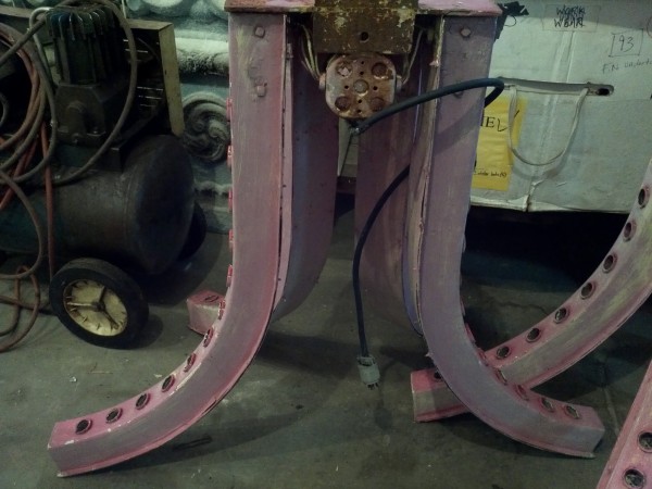Four fixtures each measuring 40″ with a span from left to right of 46″ with four “arms” holding 12 marquee lights. Steel base front to back measuring 9 1/4″ and left to right 14″ with mounting plate for bolting to pole or wall. Weight approximately 40lbs each. Nice park paint and ready for displaying……….