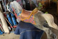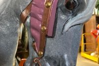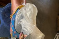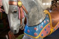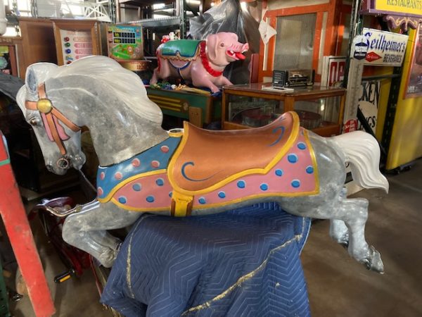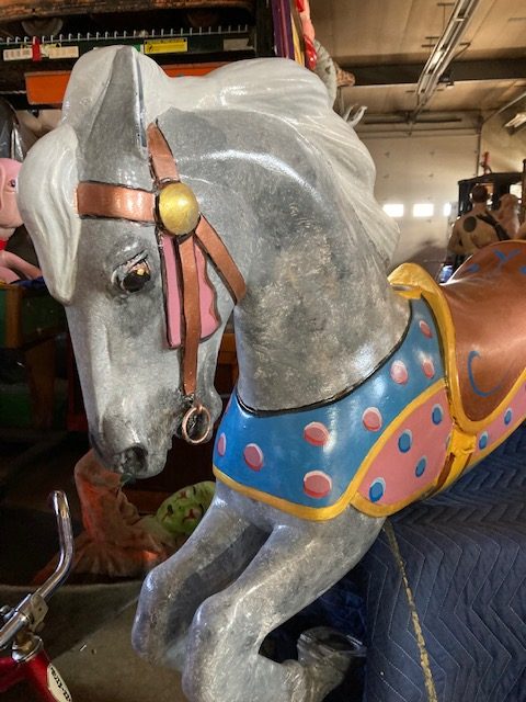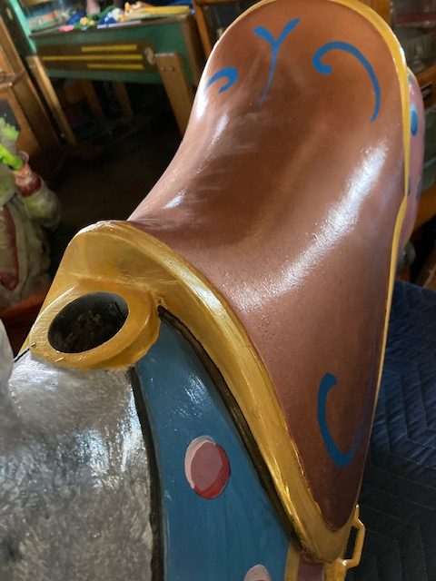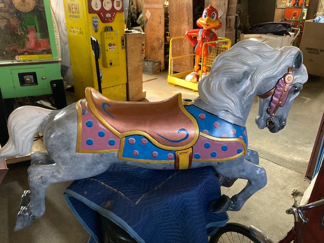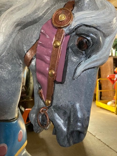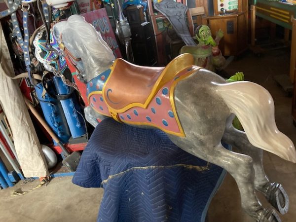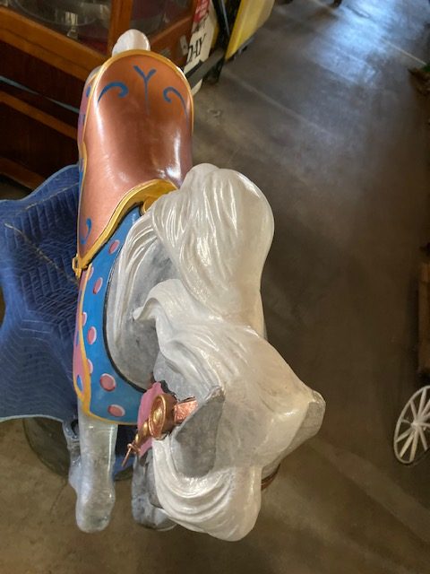 Vintage amusement park metal carousel horse in as found restored condition. Nicely done by an artist who paints and does park style restoration for Mory’s Pier in Wildwood, NJ. Heavy aluminum construction……….