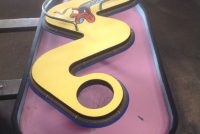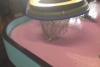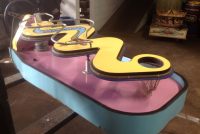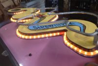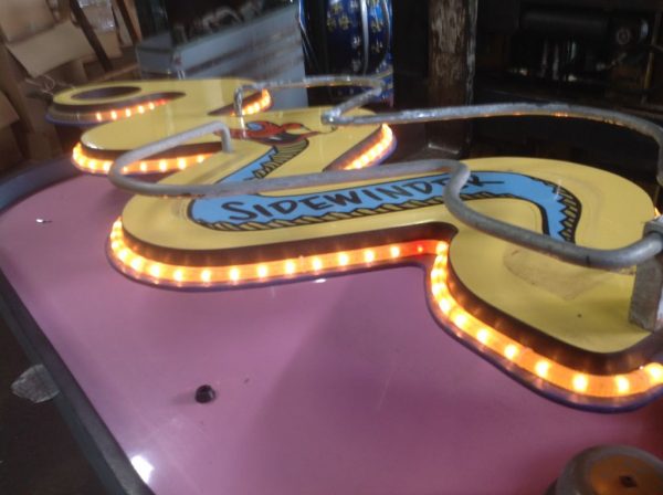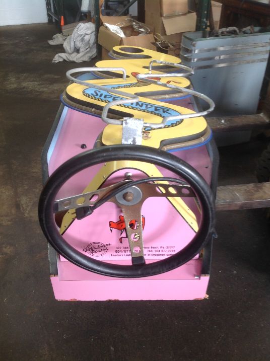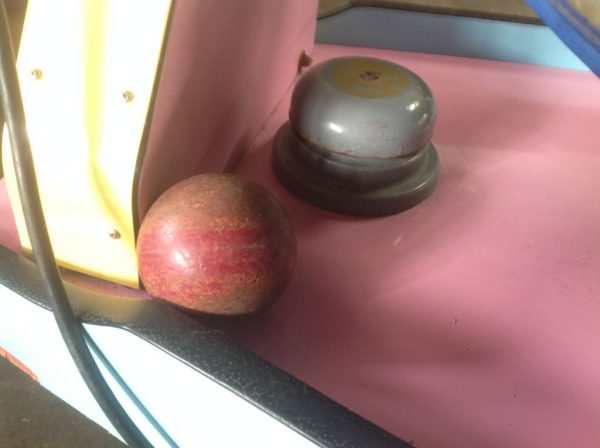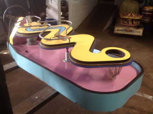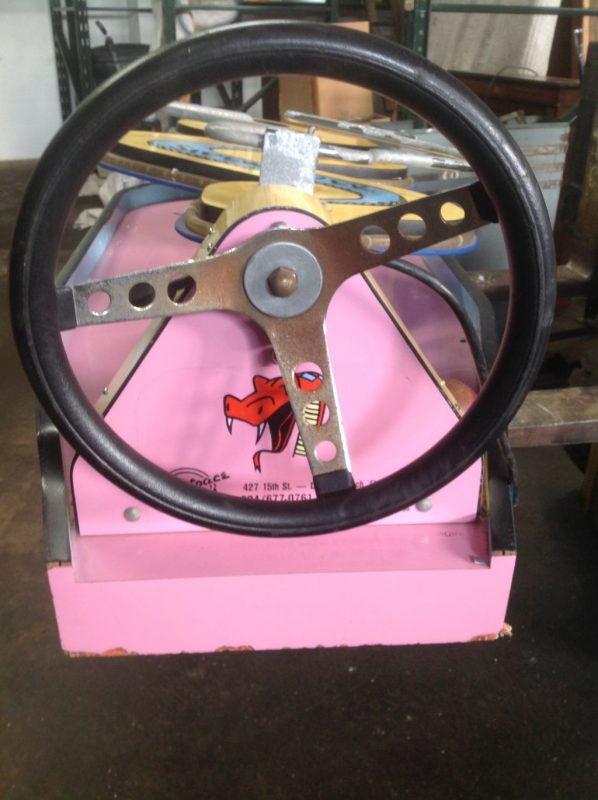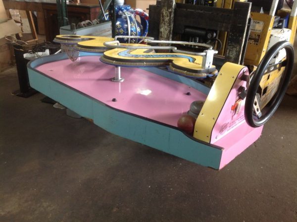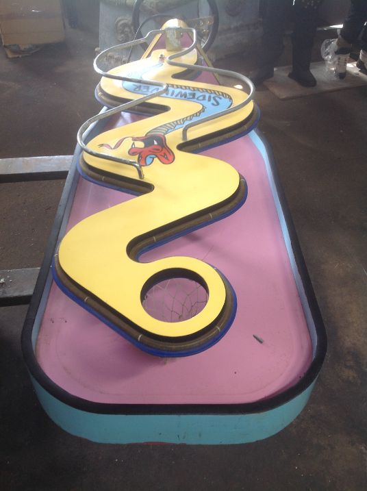 Vintage 1970’s amusement park Sidewinders boardwalk game in as found condition. Complete with ball and bell. Will need some cleaning and adjusting to work correctly. Neat game made by Bob’s Space Racers. Measures 62″ long x 17′ high x 23′ wide……….