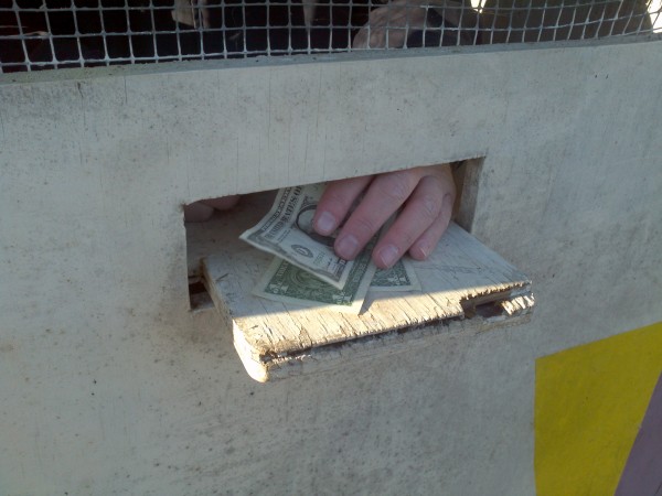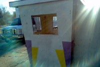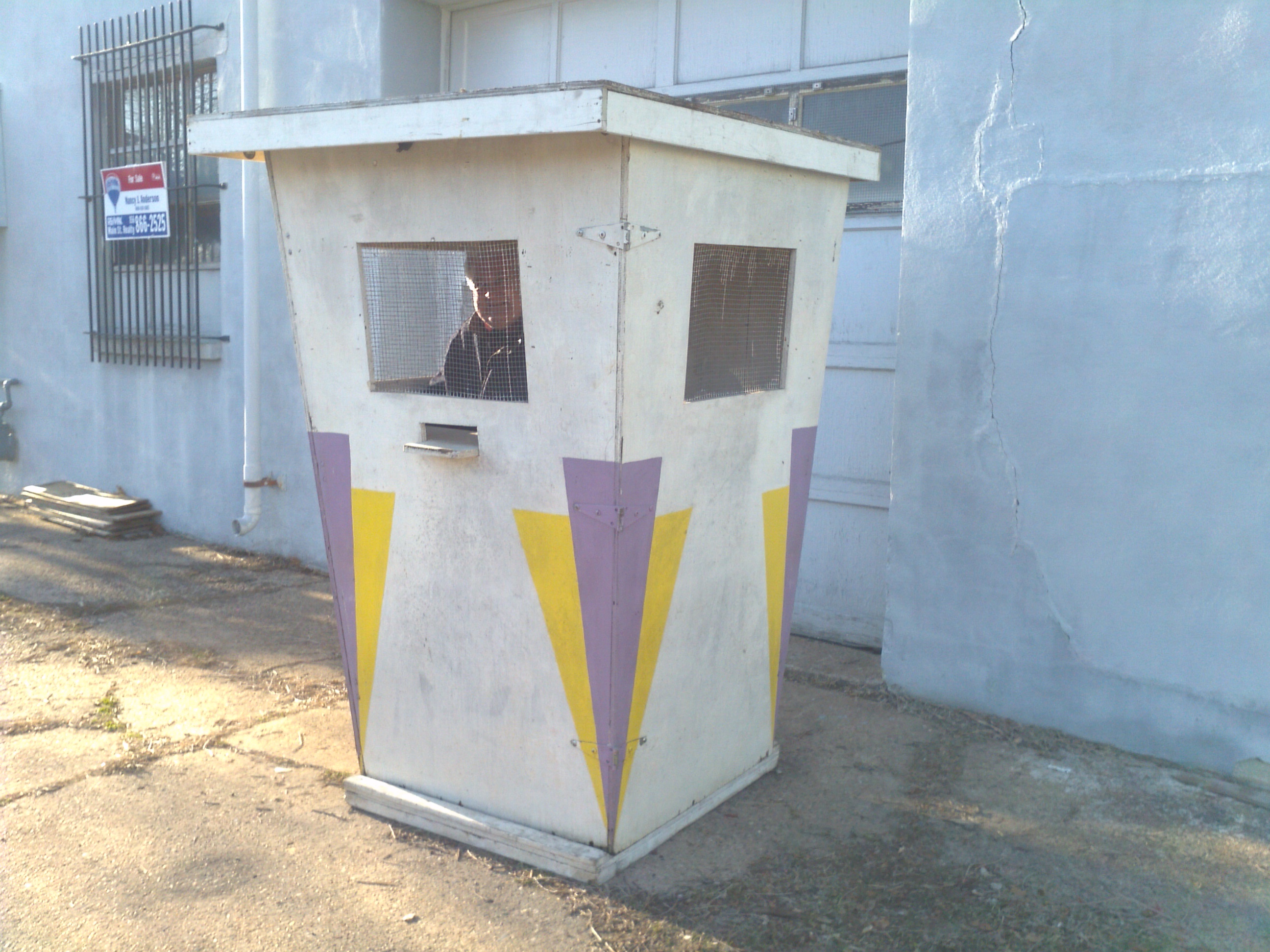 Wonderful old vintage carnival amusement park ticket booth with old park paint in as found condition. Heavy handmade plywood construction with rear entry door and ticket ledge. Nice old carnival theme painted exterior with wood floor and roof. Will need a new lighting fixture but otherwise in good shape. Put some “carny” in your life…….