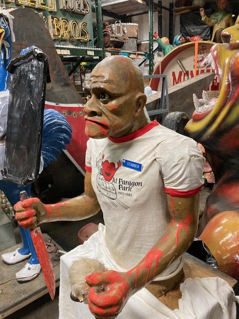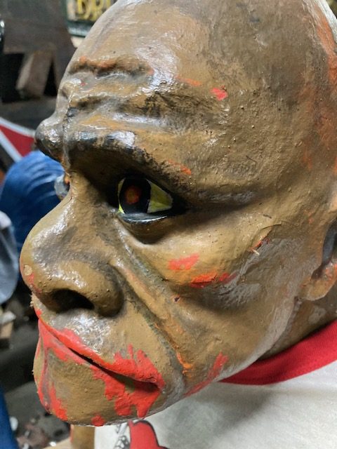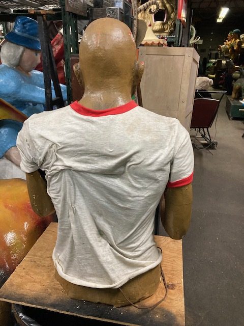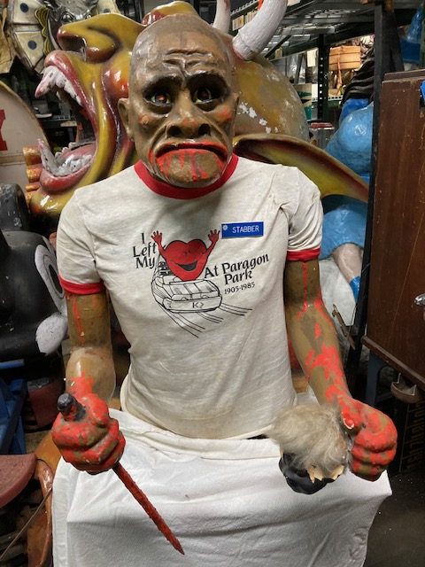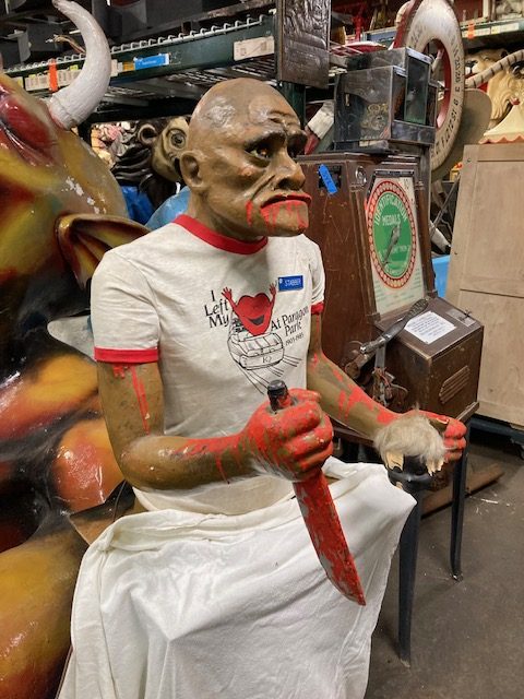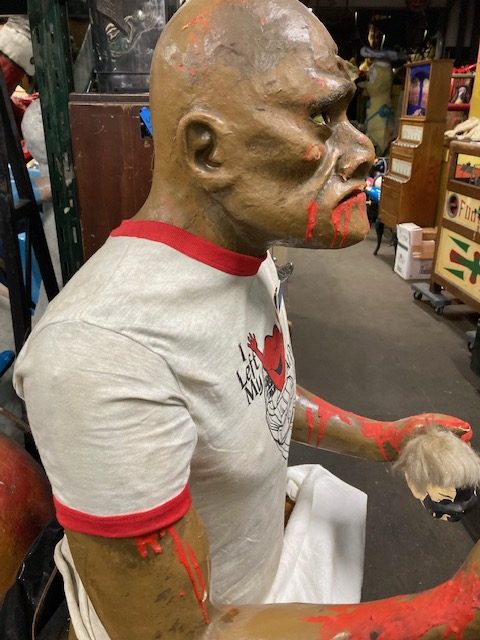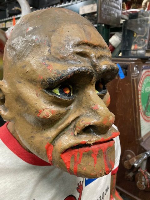 Vintage animated amusement park haunted dark ride Killer figure in as found condition. Killer goes by the name “Stabber” and was used to scare customers as they walked through the haunted display. Paper mache and plaster construction with arm movement. Neat old piece with character. Believed to be from Paragon Park that closed in 1985………..