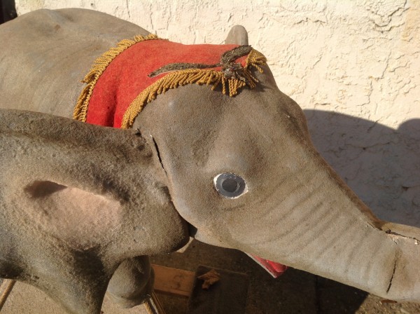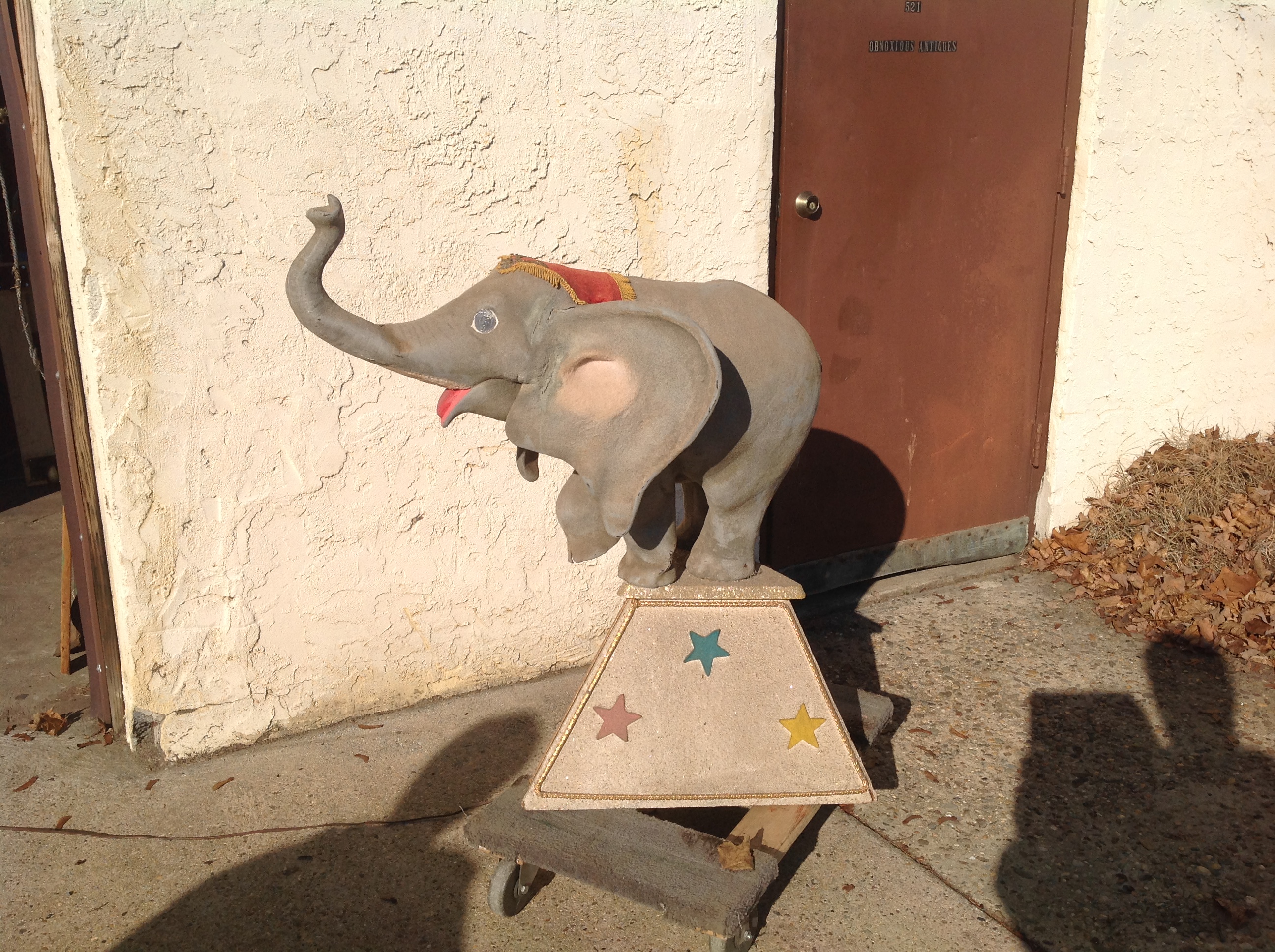 Fantastic vintage animated circus elephant store display manufactured by either ADC or Ole King Cole in as found working condition. Elephant has a few minor scuffs and dings, as can be seen in the photo’s below, but looks fine for displaying as she stands. Head moves up and down. Measures approximately 3′ x 3′ . Nice example of animation form the 1950’s…………