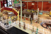 Vintage animated folk art amusement park automaton in working condition. May need some minor tweaking but otherwise a wonderful display that took the maker over 5 years of labor to finish. Ferris wheel revolves, carousel turns, boat and car ride move, other rides spin, monorail functions as well as the ski chair lift. Buildings are illuminated and the front entrance sign lights up. Comes complete with over 100 lead vintage figures. What more can I say– a fantastic folk art example. Takes up a space 8 x 4′. One of a kind…………..