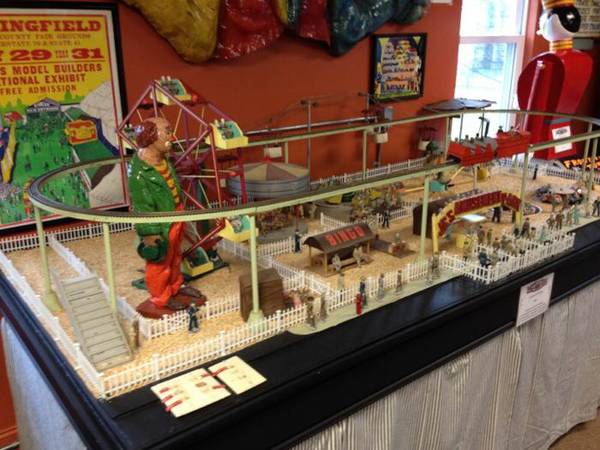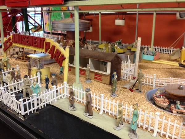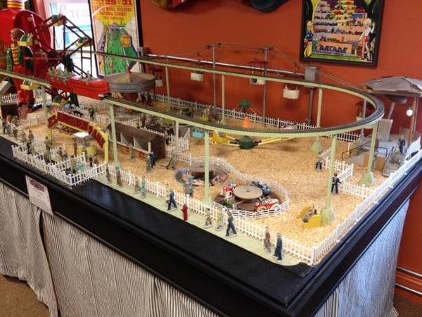 Vintage animated folk art amusement park automaton in working condition. May need some minor tweaking but otherwise a wonderful display that took the maker over 5 years of labor to finish. Ferris wheel revolves, carousel turns, boat and car ride move, other rides spin, monorail functions as well as the ski chair lift. Buildings are illuminated and the front entrance sign lights up. Comes complete with over 100 lead vintage figures. What more can I say– a fantastic folk art example. Takes up a space 8 x 4′. One of a kind…………..