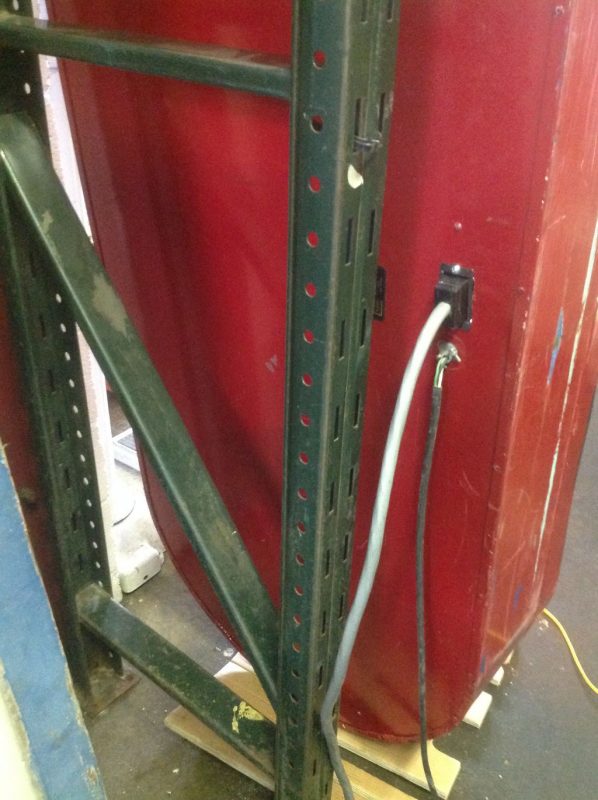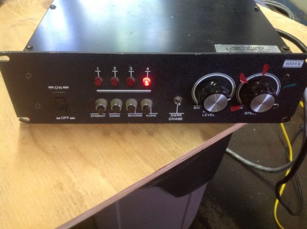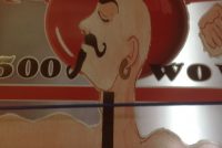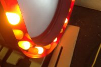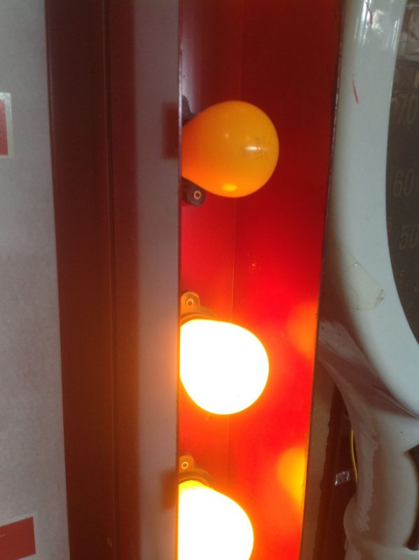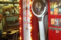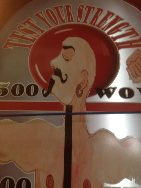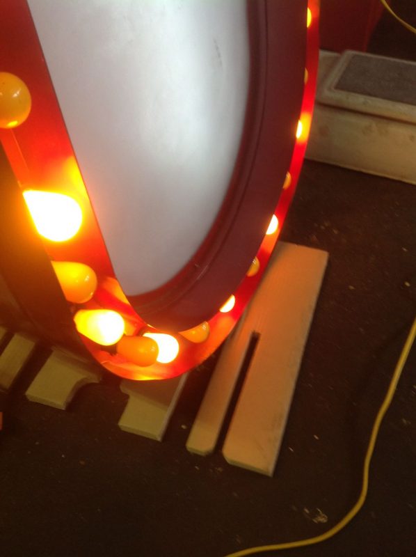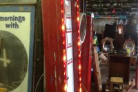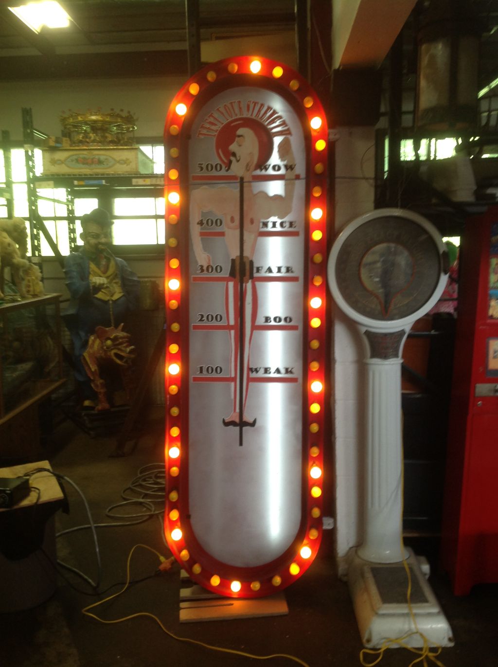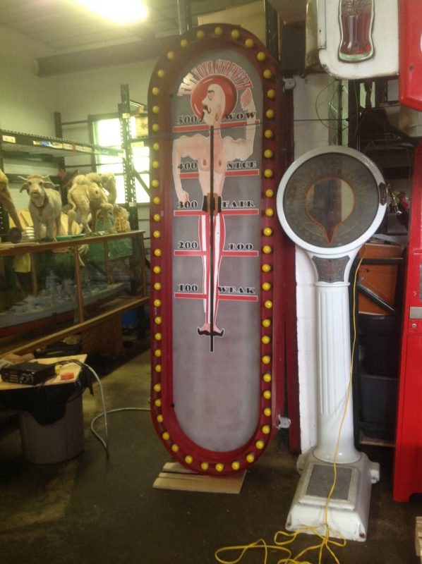 Vintage flashing animated marquee sign with controller in as found working condition. Sign measures 8′ tall x 30″ wide x 11″ thick. Wonderful sign with weight lifting theme. Complete with marquee bulbs and metal can…………..