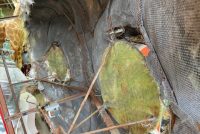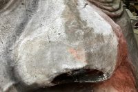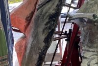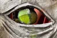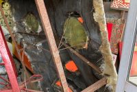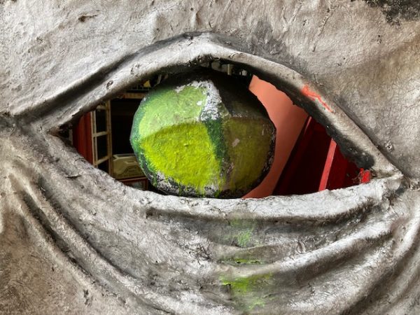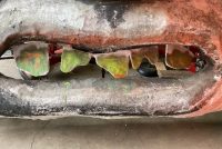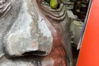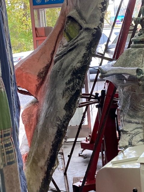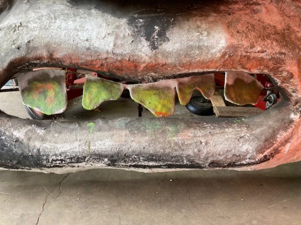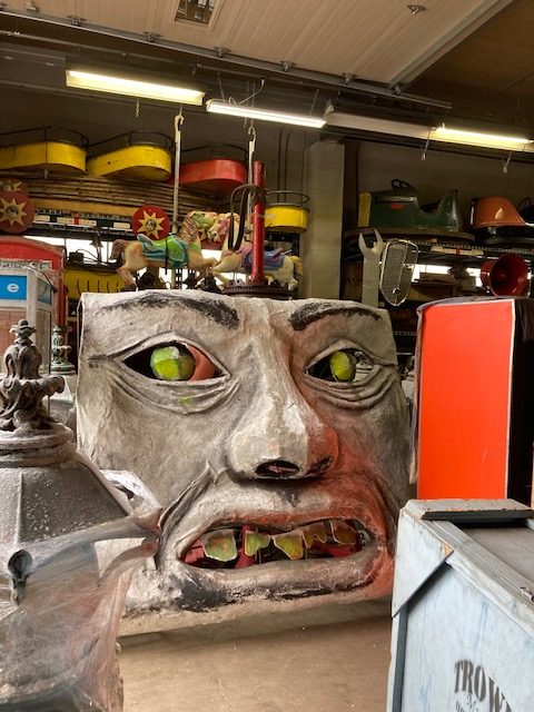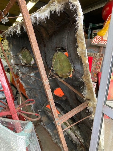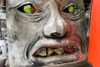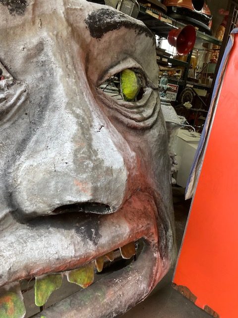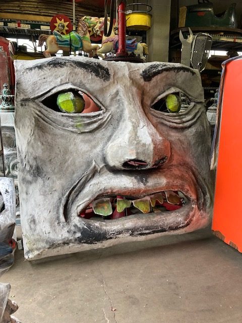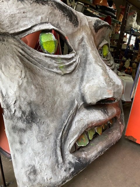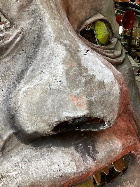 Vintage fiberglass animated New York funhouse dark ride head in as found condition. Eyes move side to side as the teeth go up and down. Motor for animation of eyes is attached and working well. A motor and linkage will need to be installed to make the teeth animated. Not a hard thing to do. Heavy and well constructed……….