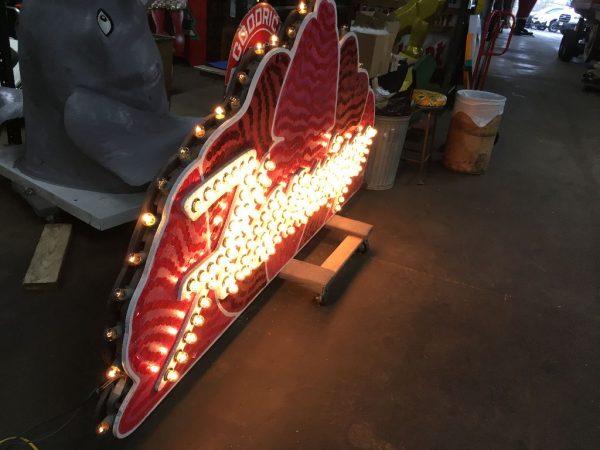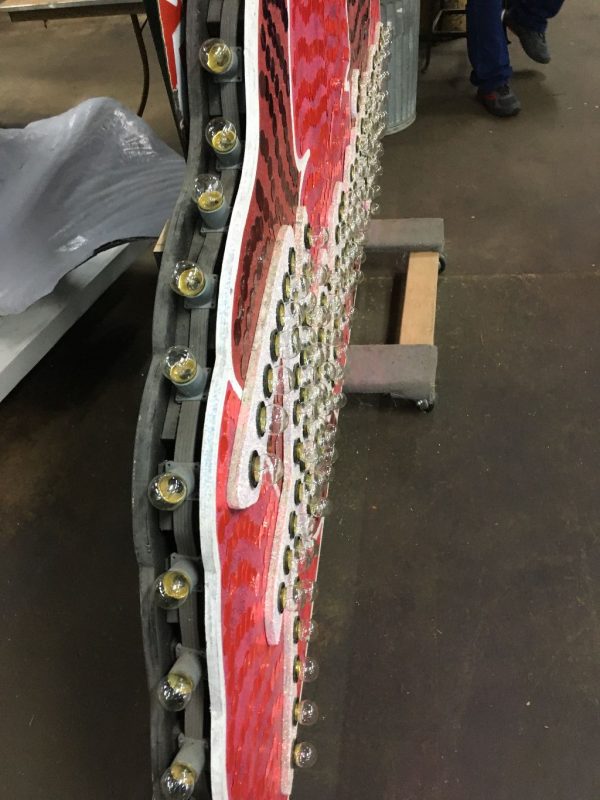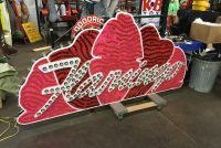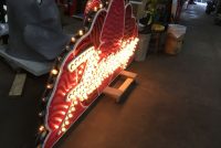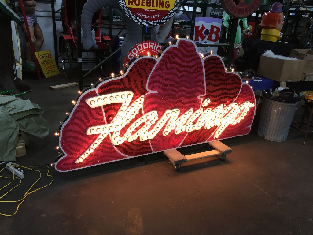 Vintage animated stage prop Flamingo lighted sing in working condition. New bulbs installed. Measures almost 8′ long. A beautiful addition to any sign collection.