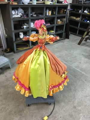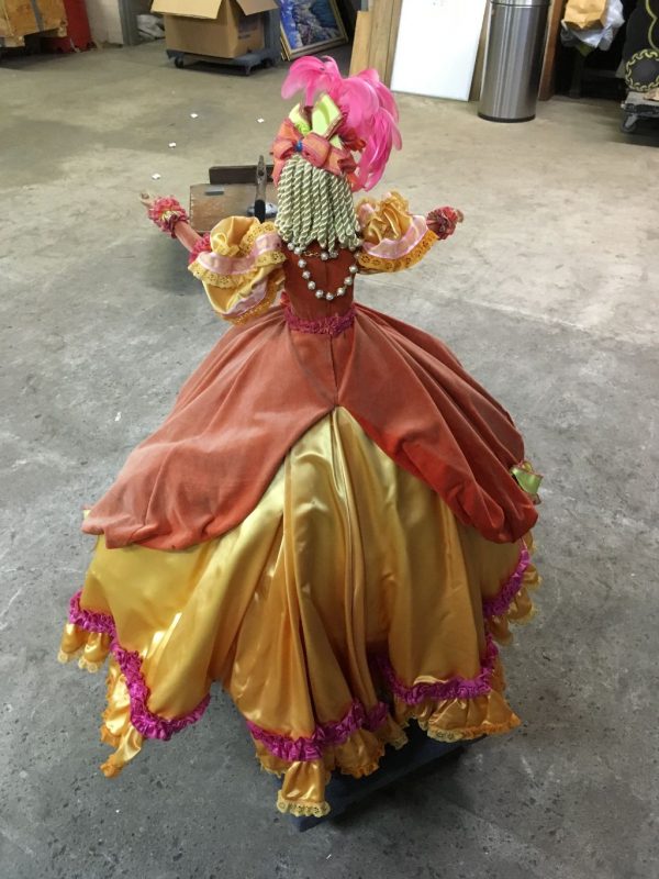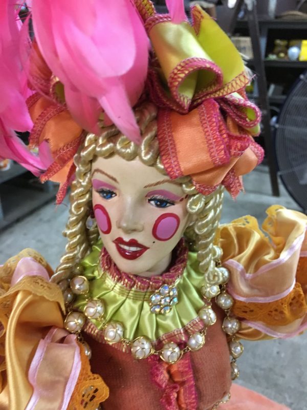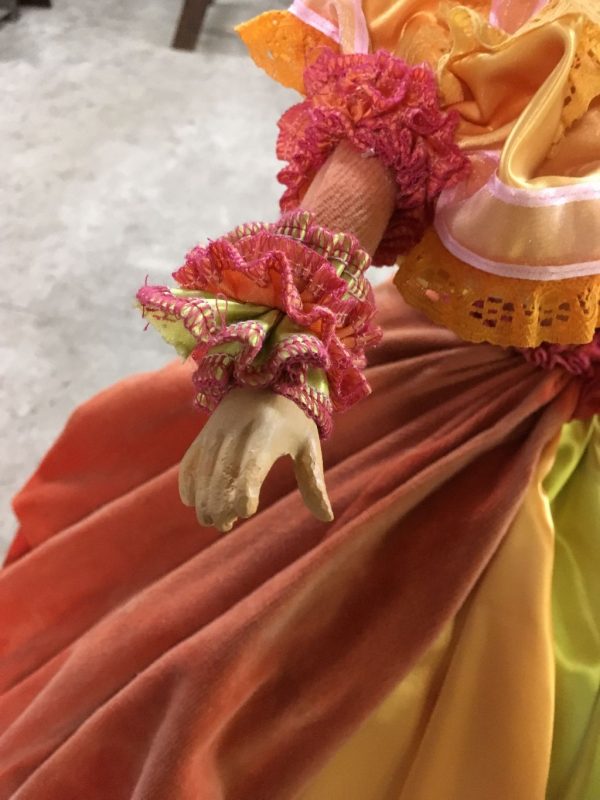 Vintage animated window display dancing woman figure in as found condition. Figure works well with beautiful clothing detail. Will need some cleaning and some fabric to cover motor housing. About 3′ tall. Manufactured by Sylvestri………..