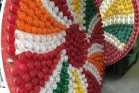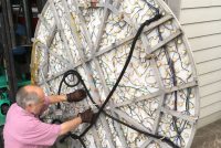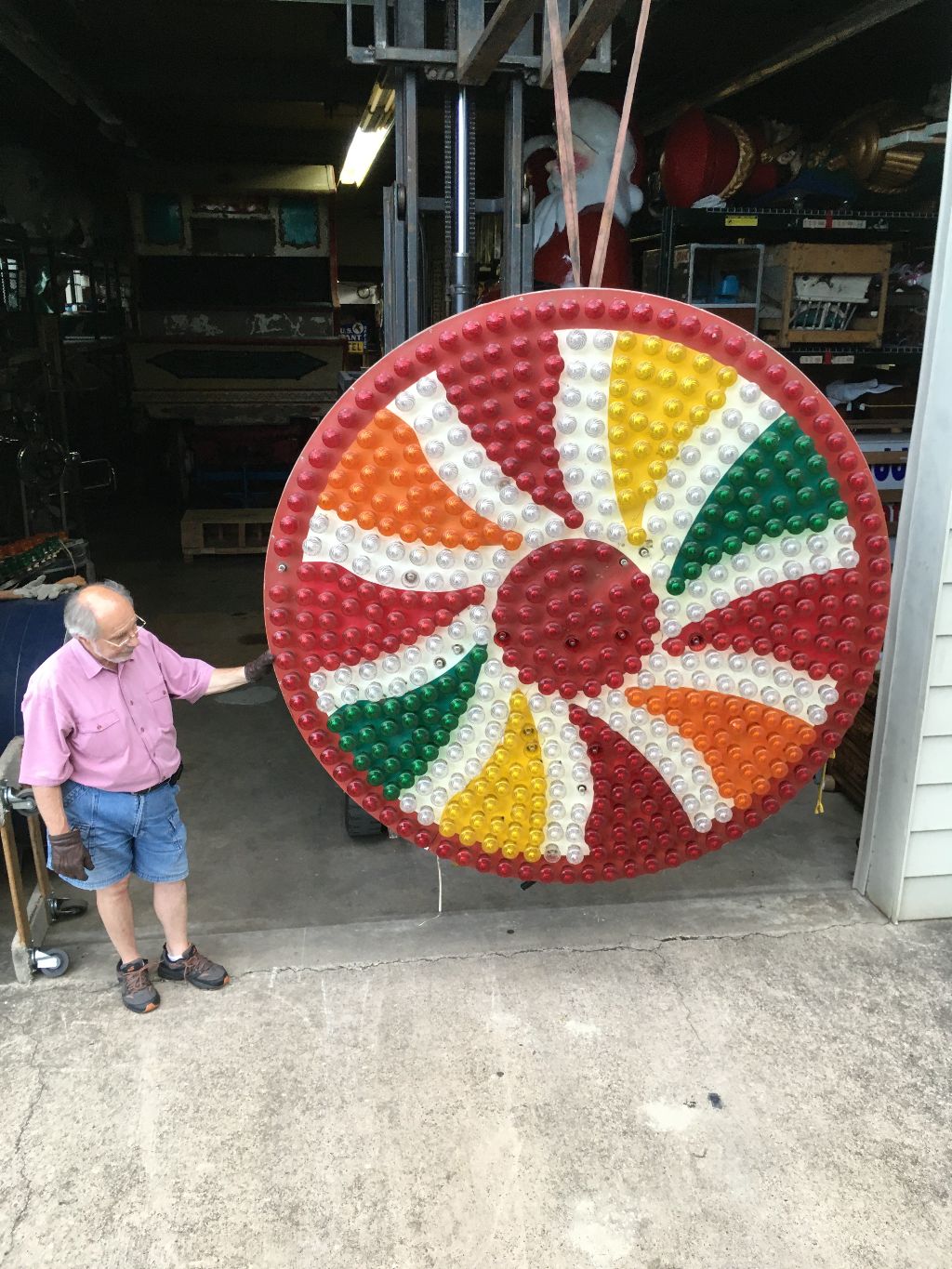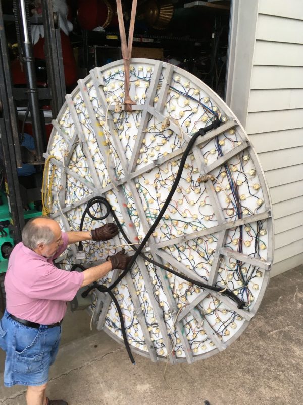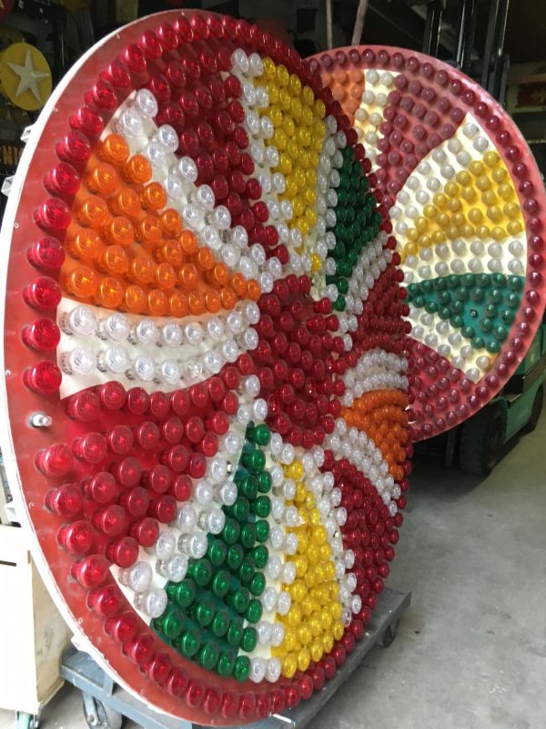 Vintage turbo light Atlantic City Steel Pier ferris wheel center illuminated design in as found condition. Will need to be refurbished and rewiring done. Extra turbo plastics, lights and bases will be included to help restoration along. Measures about 8′ in diameter. 1 available. Well look spectacular when lit…………..