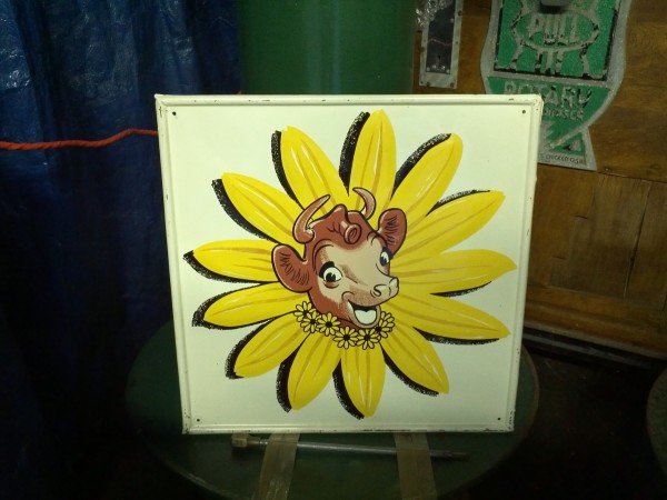Vintage embossed Borden’s Elsie The Cow dairy advertising sign measuring 17 1/2″ x 17 1/2″. Nice condition, bright colors. Good sign for anyone collection…..