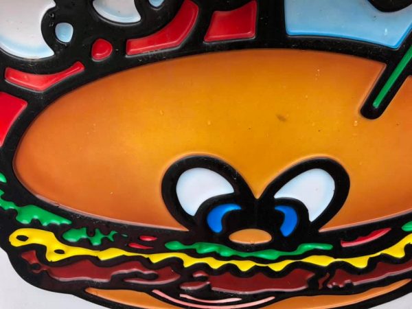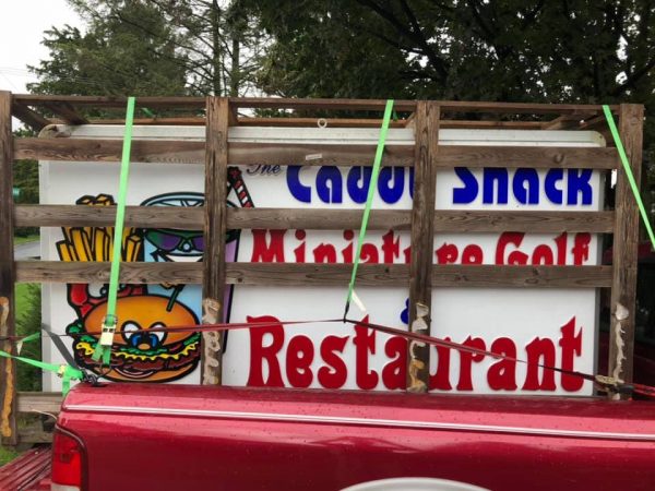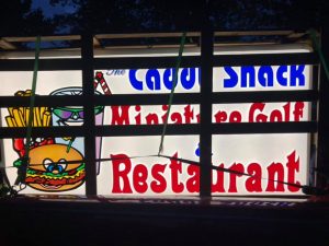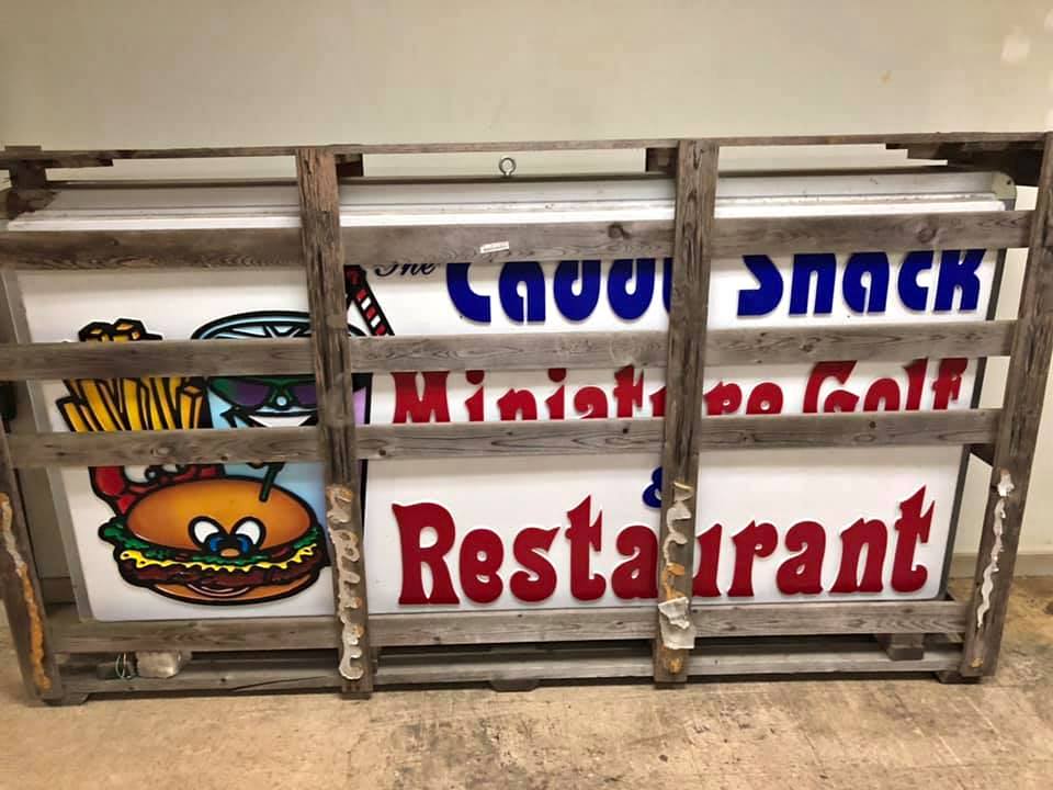 Vintage double sided Caddy Shack miniature golf sign in as found condition. New old stock, never used, still in shipping crate. Vacuum formed fronts with bright colors. Needs a new home, please. Measures 8′ long x 4′ high. Can you help?……………….