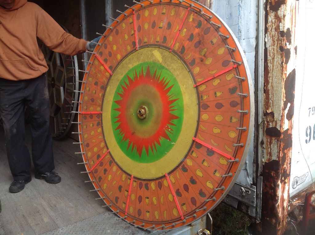Vintage carnival Big 6 fruit wheel in as found condition. Complete with stand. Wheel is old and shows many years of use. Nice overall shape needing minor cleaning. Older midway carnival wheels are getting harder to find. Get this one before its gone…………..