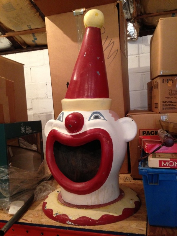 Vintage fiberglass carnival clown trash can topper in as found condition. Nice condition for it’s age. Measures 48″ tall and will fit most trash cans. Would look great in the gameroom, kids or bathroom…..