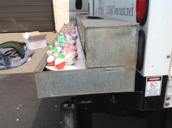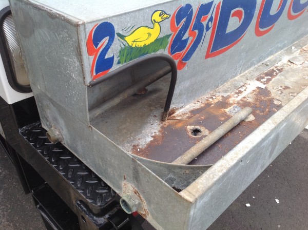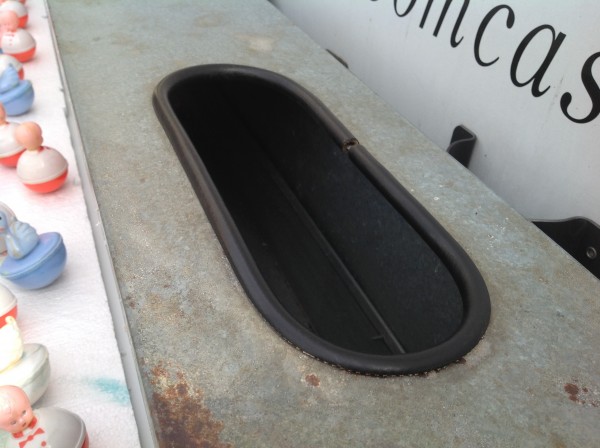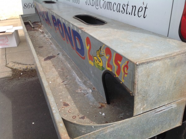 Nice old vintage carnival midway duck pond with ducks, in as found condition. Comes complete with weighted ducks and babies and piped for water use. Made from galvanized steel, measuring 95″L x 18″W x 12″H. Just a great piece to add to you collection with good graphics………..