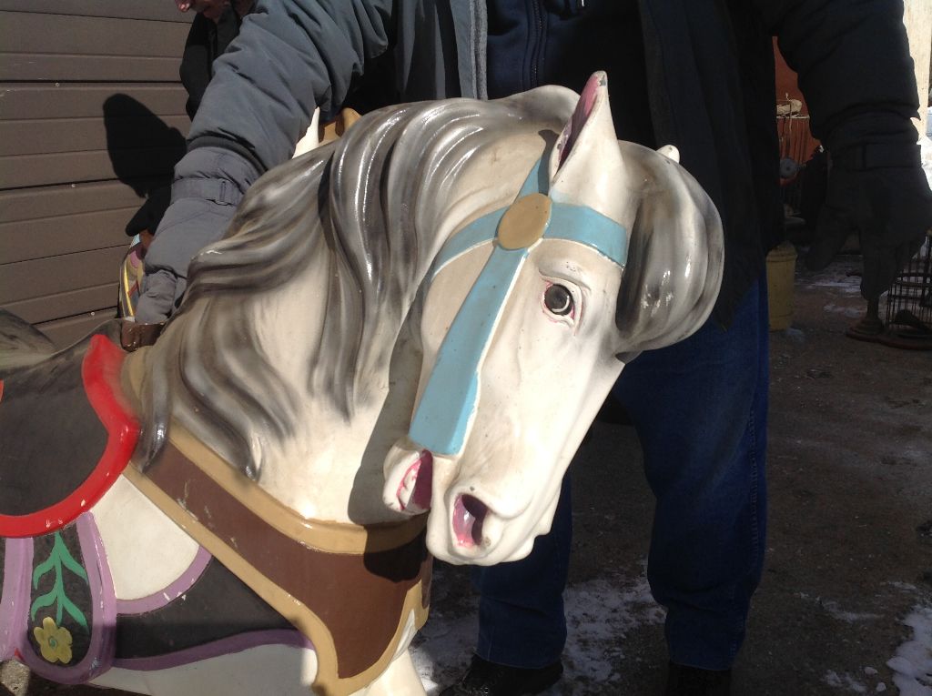 Fiberglass reproduction older style carousel horse in as found condition. Some minor nicks and dings but will display very well.