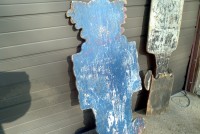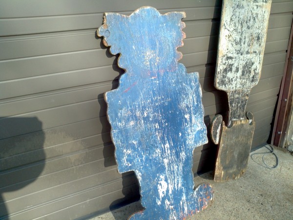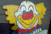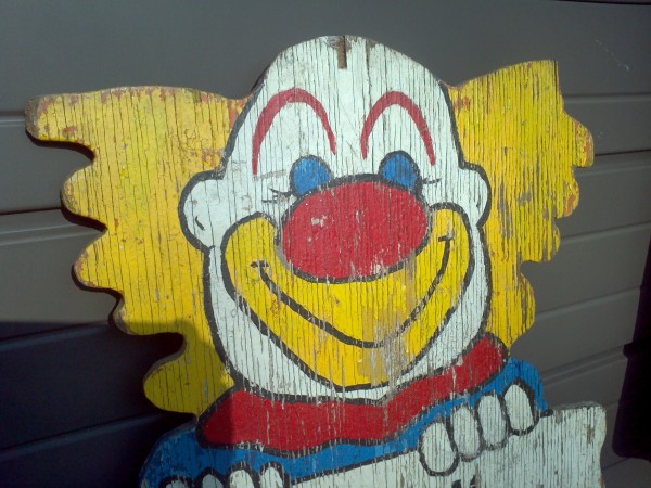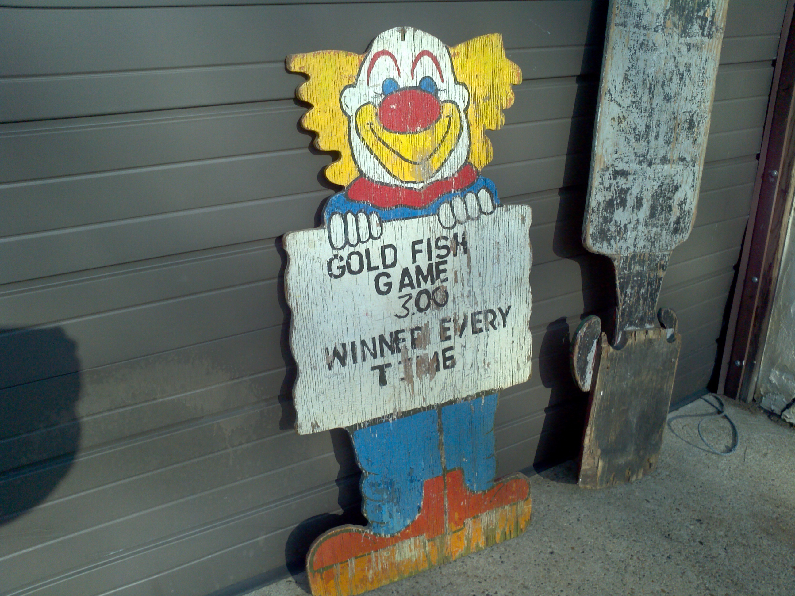 Vintage carnival gold fish clown sign in as found condition. Used in a old gold fish game along a New Jersey carnival midway. Old park paint with peeling but adds character to this most unusual carnival item…………