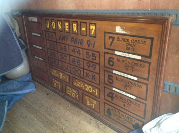Vintage carnival Joker-7 odds board in as found condition. Will need some minor cleaning to remove white tape from wood surface. Nice piece of wall art. Large, about 4′ x 8’……………