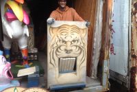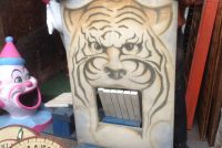 Just found, vintage carnival tiger ball pitch in as found condition. Painted canvas with wood teeth. Wonderful example of early carnival pitch game. 2 available. Large, about 3′ x 5’………….