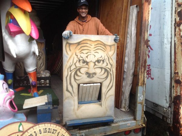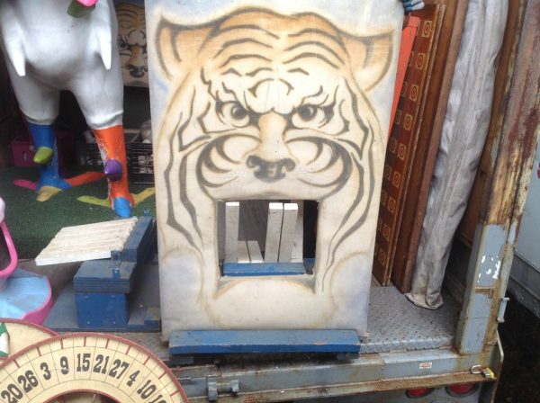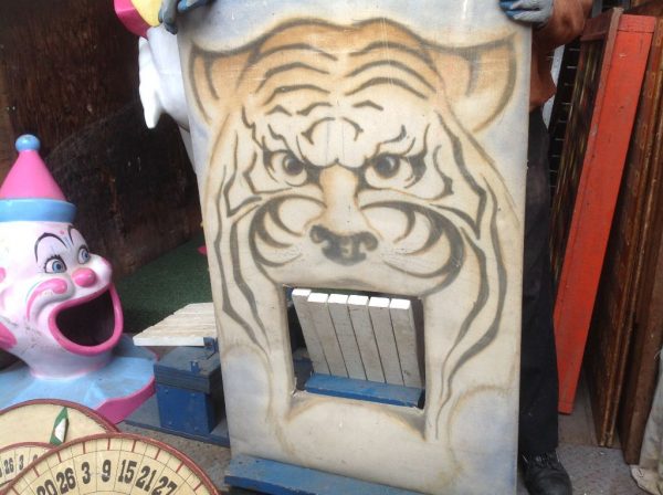 Just found, vintage carnival tiger ball pitch in as found condition. Painted canvas with wood teeth. Wonderful example of early carnival pitch game. 2 available. Large, about 3′ x 5’………….