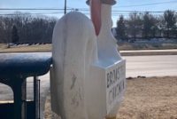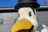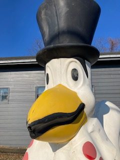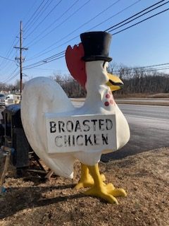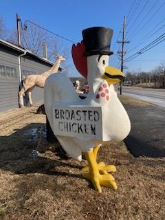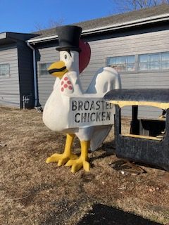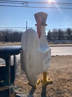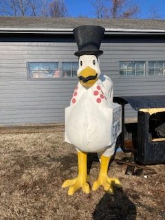 1960’s Chicken restaurant fiberglass Broasted Chicken advertising statue in as found condition. This “CLUCKER” towers about 10′ tall with original advertising and Top Hat. Not an easy fiberglass figure to find in any condition…………