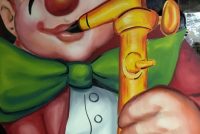Vintage Circus Clown Playing Saxophone Wooden Panel