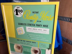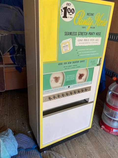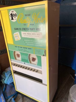 Vintage coin operated pantyhose vending machine in as found condition. Beautiful graphics. Comes complete with some original pantyhose stock. A real attention getter. When the last time you saw on of these?………..