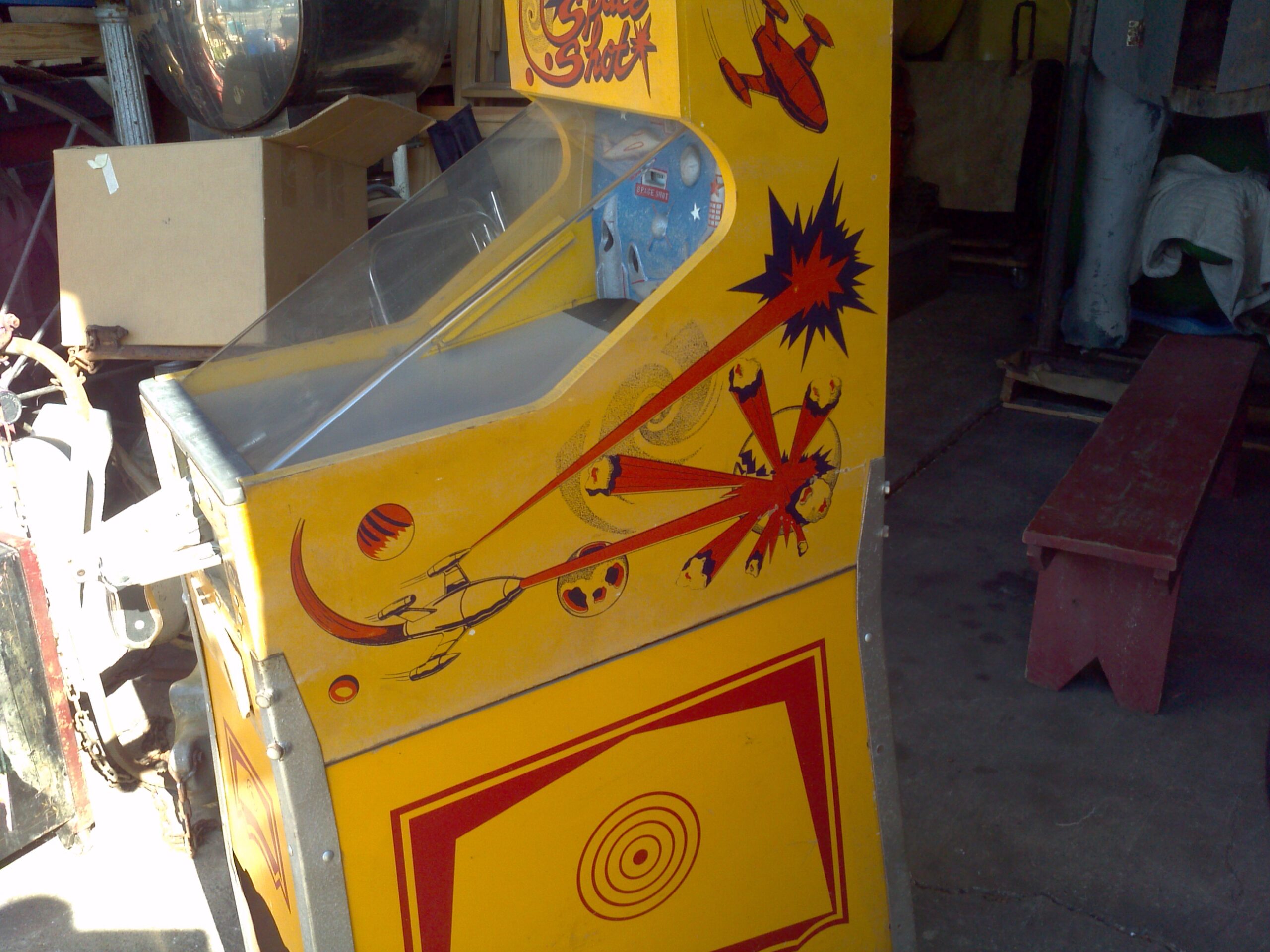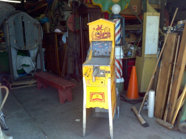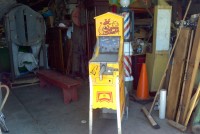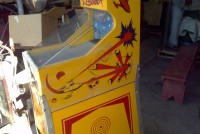 Vintage coin operated J.F. Frantz A.B.T. space gun arcade game in as found working condition. Coin mech changed to 25 cents from 10 cents and game will need adjustment to work correctly. Back door is cracked and a piece of time missing from roof, otherwise in very good condition. Family fun game……….
