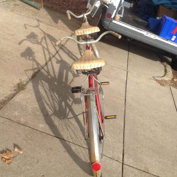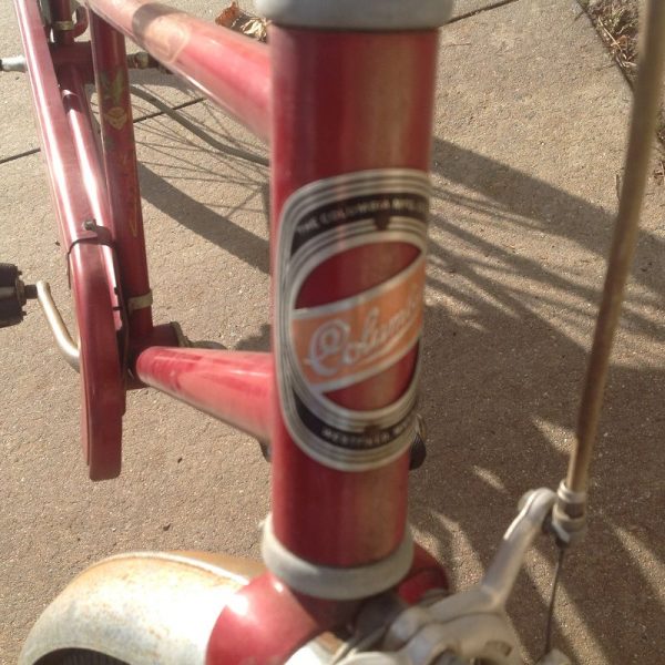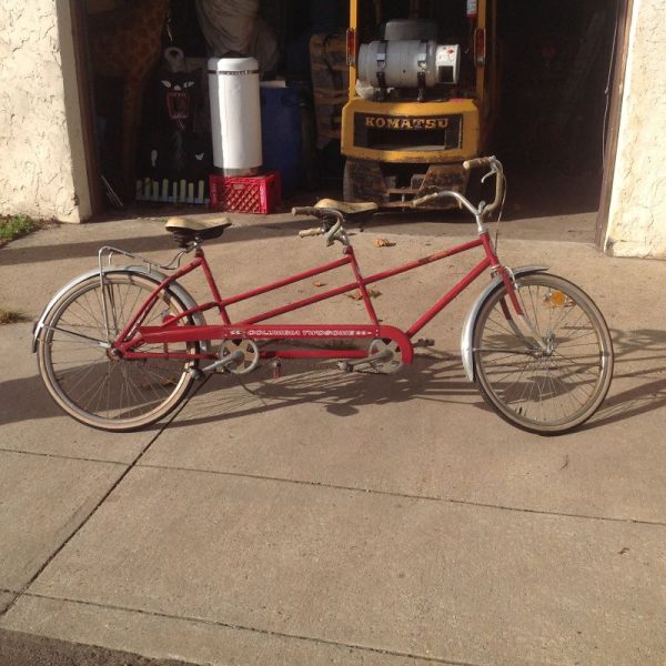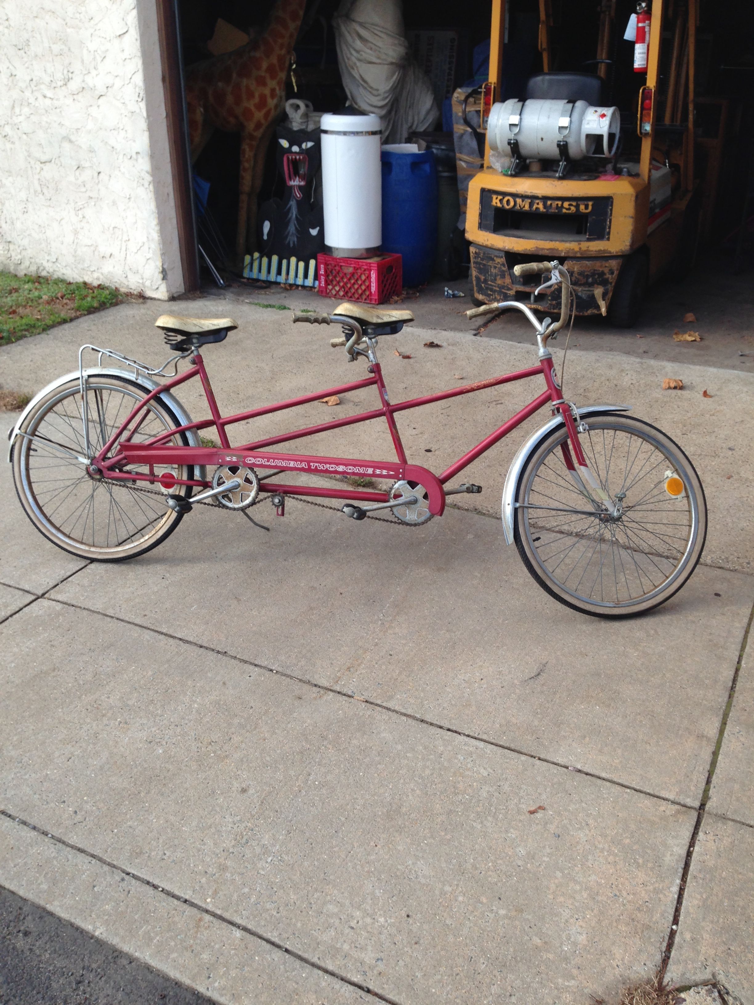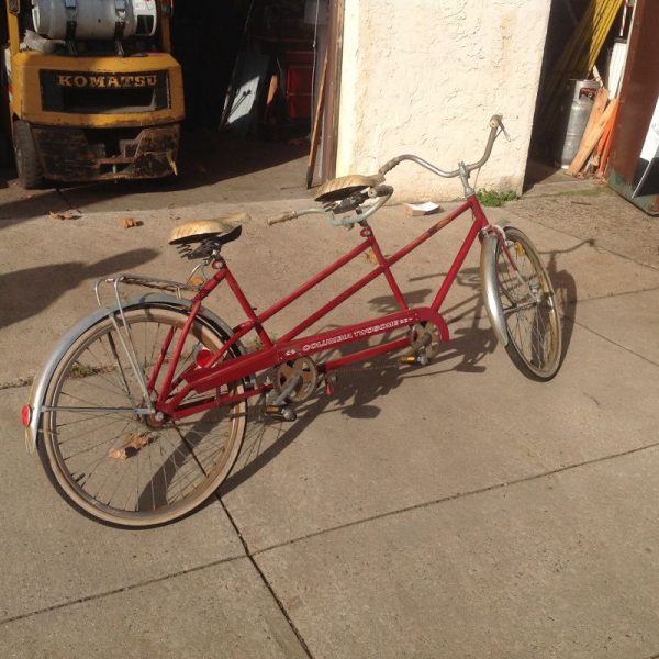 Vintage 1950’s Columbia Twosome two seater bicycle built for two bike in as found condition. Will need some restoration as the chrome has some pitting and  front light is missing, otherwise comes complete with what looks to be original seats.  Nice project for the handyman in you……………