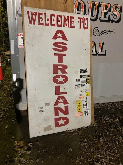 Vintage Brooklyn New York Astroland metal sign in as found condition. Sign measure about 4′ x 8′ with many decals from the 1970/1980 era. From Coney Island just before the closure of Astroland. A real iconic sign from Coney Island…………