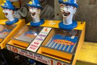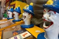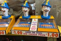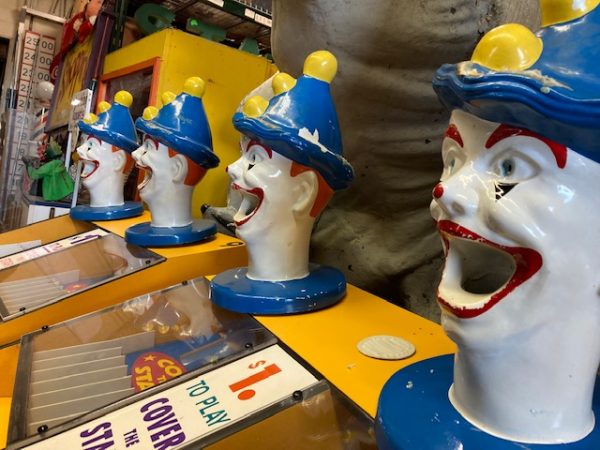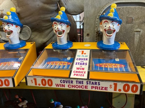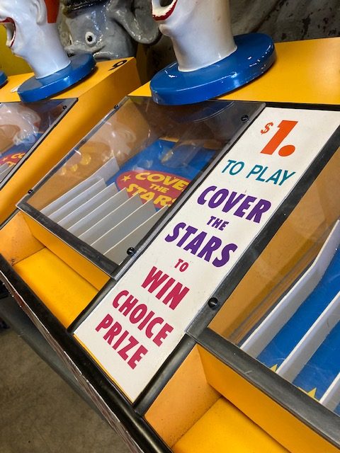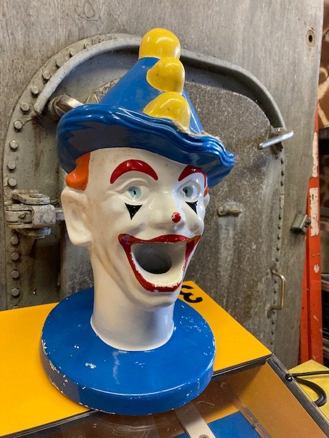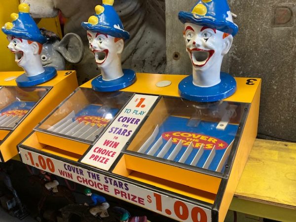 Vintage Coney Island Feed Clown Cover The Star game in as found working condition. Used by “Benny” the legendary game operator under the “BIG WHEEL” at Coney Island. Clown heads rotate left to right as you put balls into the clowns head to direct the balls towards the star slots. Cover all start and win “Choice”. 1 available