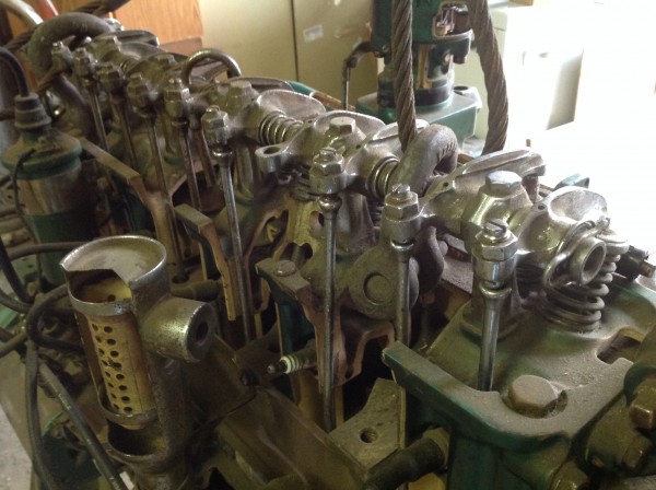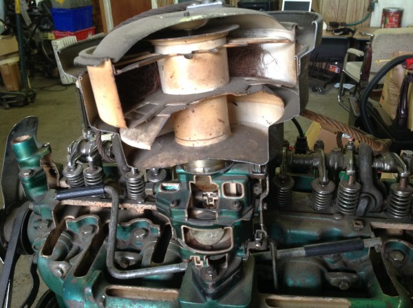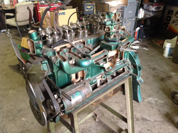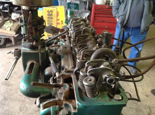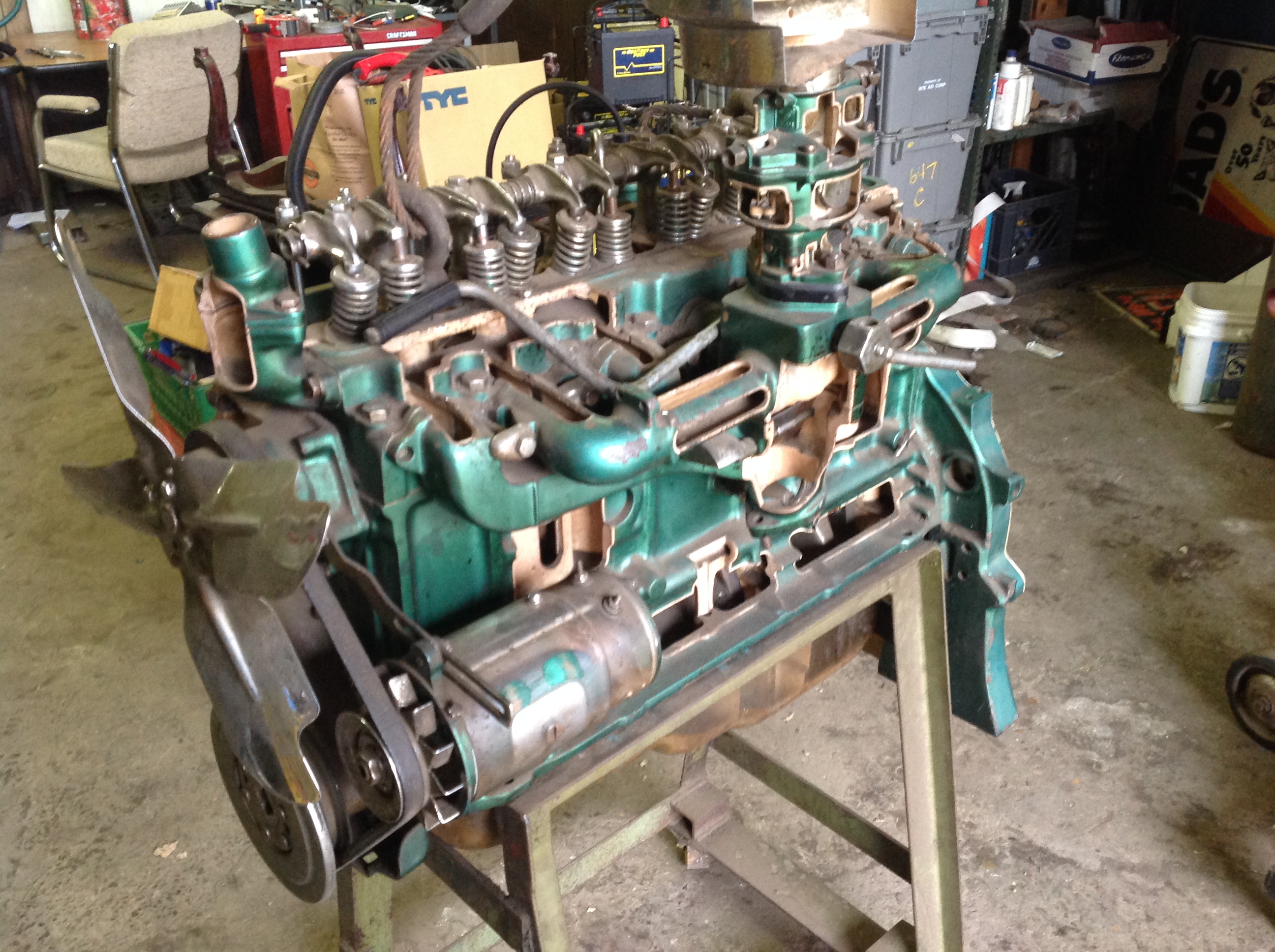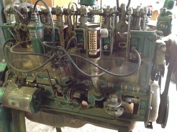 Vintage working shop display Chevy 235 cutaway engine in as found condition. Complete with crank to animate functions of the engine. Missing two push rod screw bolts but the rods are there. Stress crack in the oil pan but otherwise in very good condition for it’s age. Works smoothly. Pictures tell the story and say it all……..