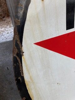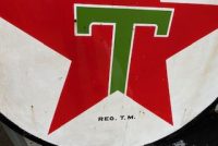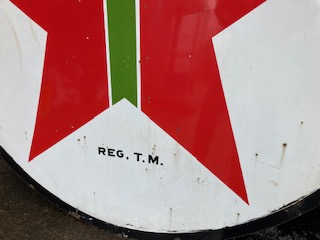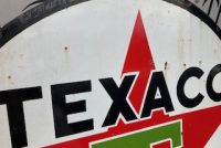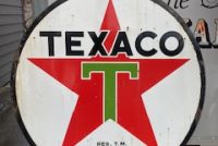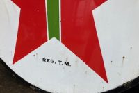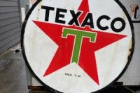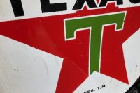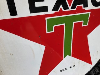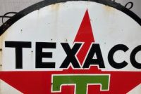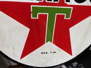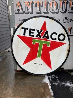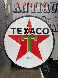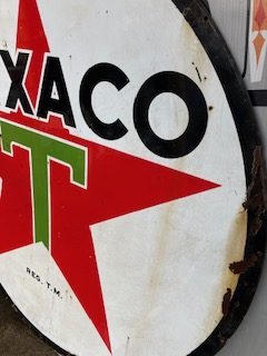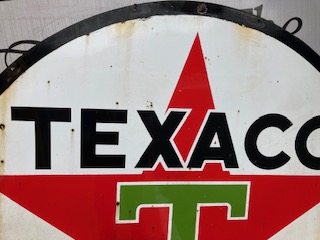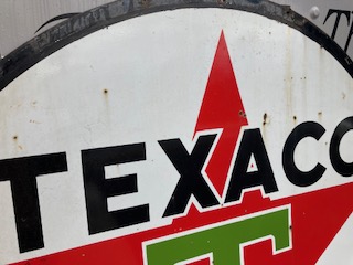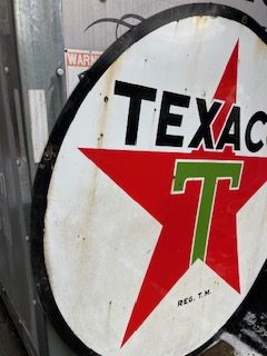 Vintage double sided porcelain Texaco Gas Station sign measuring 6′ in diameter in as found condition. Nice shape overall with the usual scratches, dings and few circular bends on perimeter.Both sides have bright colors needing a good cleaning………….