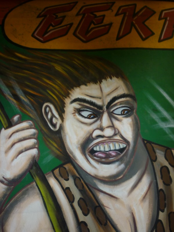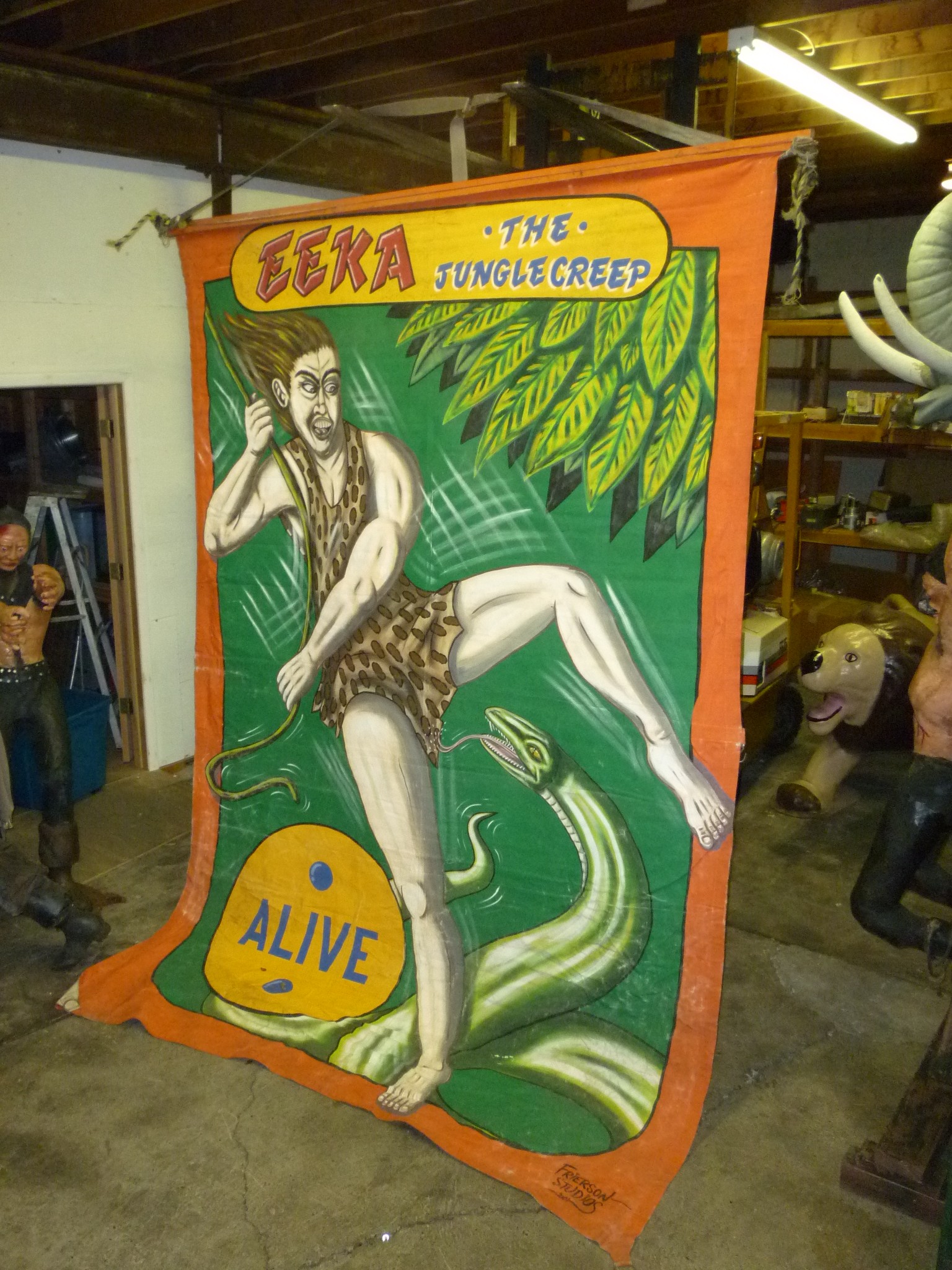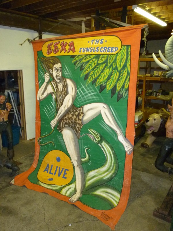 Large canvas sideshow banner signed Frierson Studios. Frierson started his banner painting career in 1980, Tampa, Florida and is currently the youngest of three remaining banner painter left in the United States. Measures about 10′ x 8′ with minor paint loss. For additional information, email or call…..
