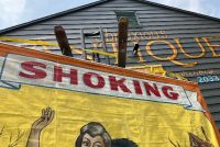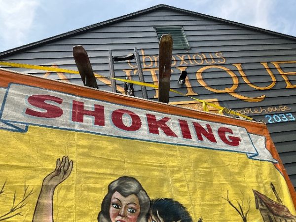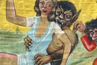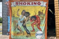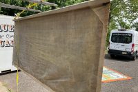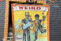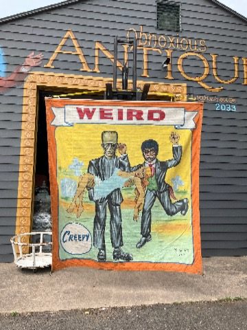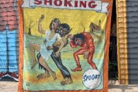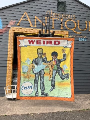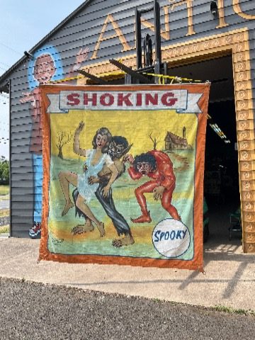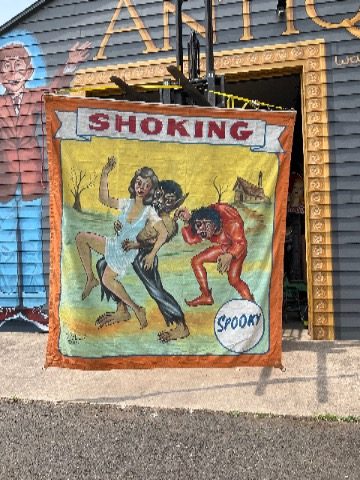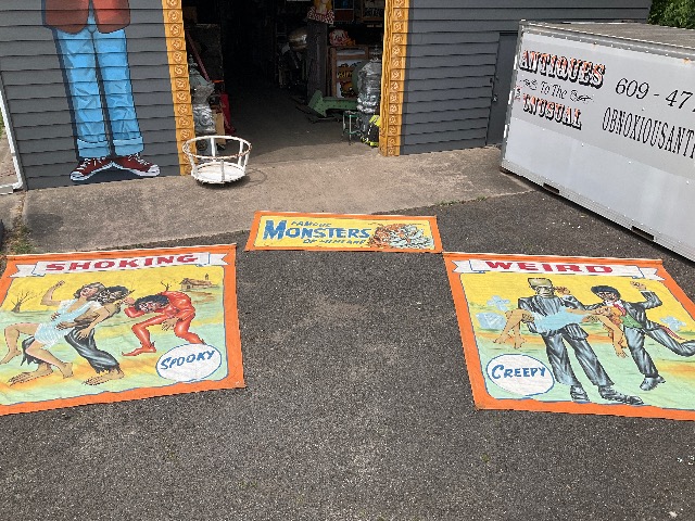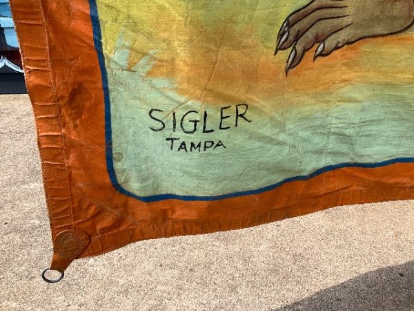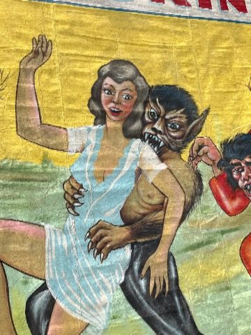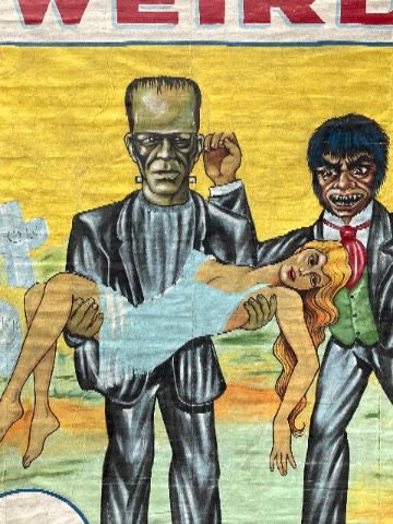 3 vintage famous Monsters of Filmland Horror sideshow banner set by artist Sigler in as found condition. Monster header banner measures 4′ x 9′, the other two banners measure 9′ x 9.5″. Jim died less than a year ago and purchased from his estate a few months back. Jim, his father and uncle were sideshow painters in the Florida area. Great subject mater. Sold as a set of three only……….