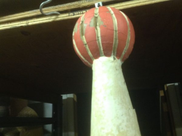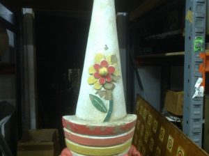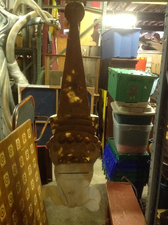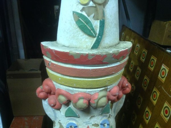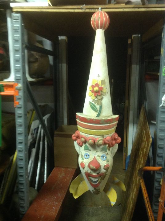 Vintage fiberglass amusement park clown head in as found condition. Nice old park paint but needing some restoration as paint is peeling. Measures almost 4′ 6″ tall x 12″ wide. Won’t you give him a good home………….