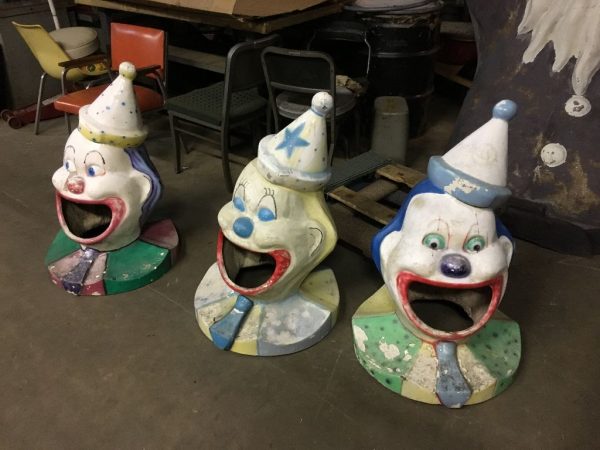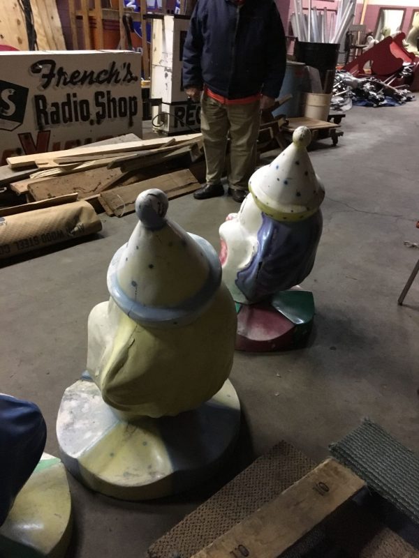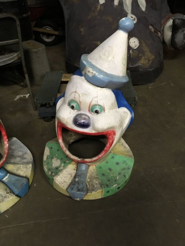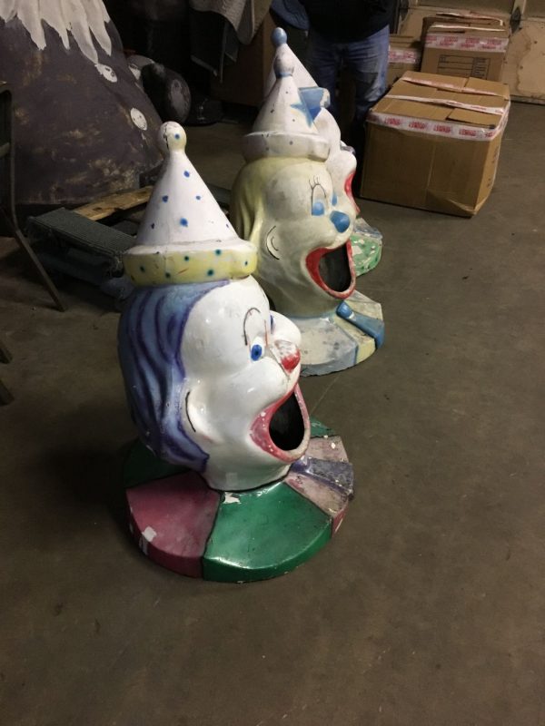 Vintage fiberglass amusement park clown trash can lid toppers in as found condition. Nice overall shape with some minor dings and cracks. 3 available, all needing some cleaning, paint touch up and perhaps some minor restoration. You be the judge. After cleaning, all will display well. Sold by the piece………….