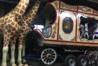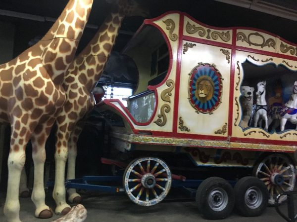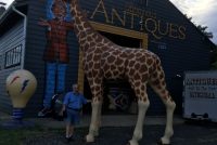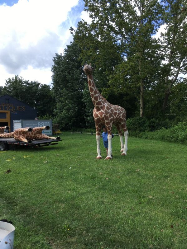 Vintage 14′ fiberglass miniature golf Giraffe manufactured by Creative Fiberglass in as found condition. 2 are available. All in very nice shape from the now closed Magic Forest amusement park, Lake George, NY.